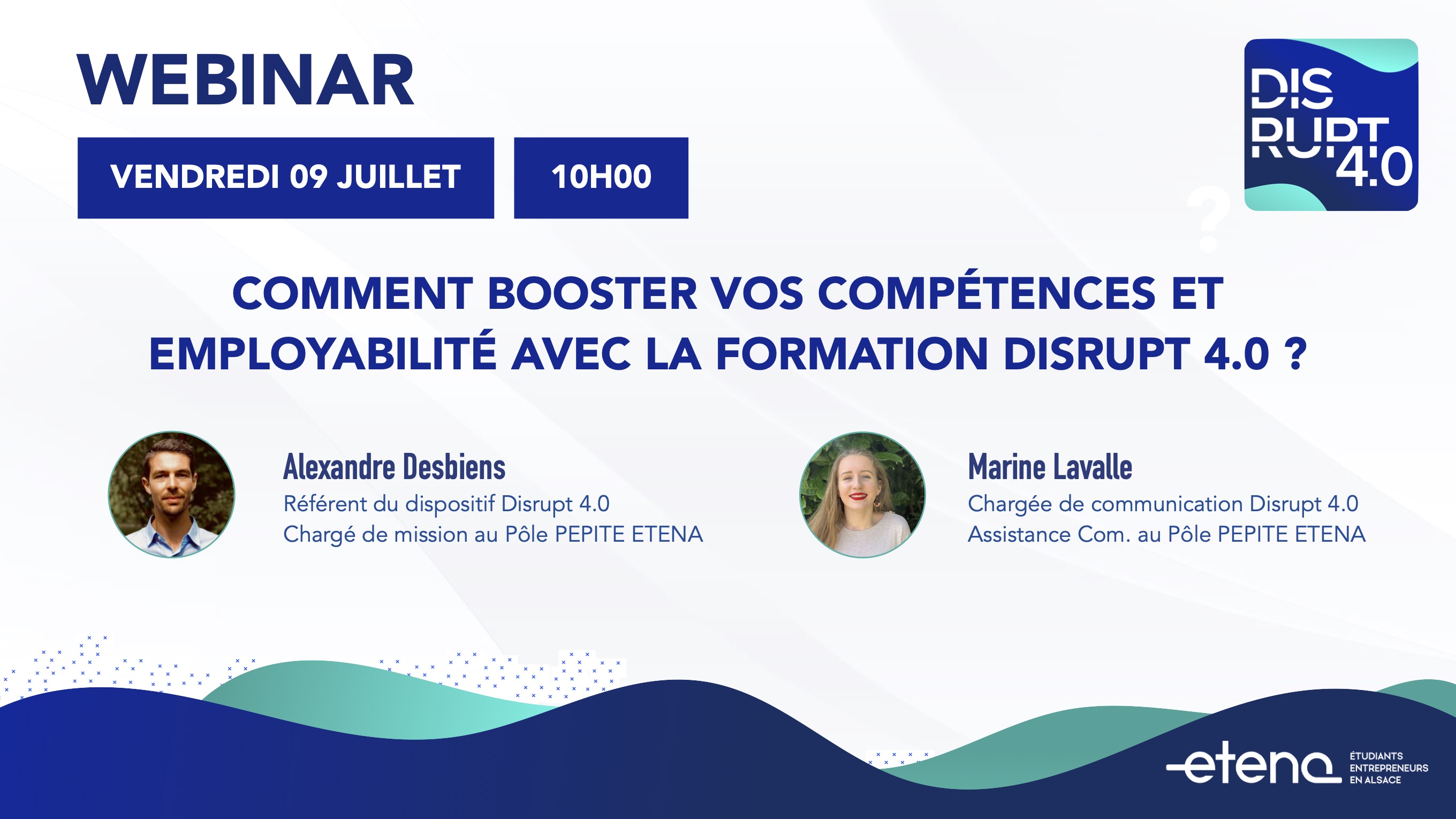 Un webinar en ligne intitulé « Comment booster vos compétences et employabilité avec la formation Disrupt 4.0 ? » est proposé le 9 juillet de 10h à 11h par le Pôle Pépite Etena.