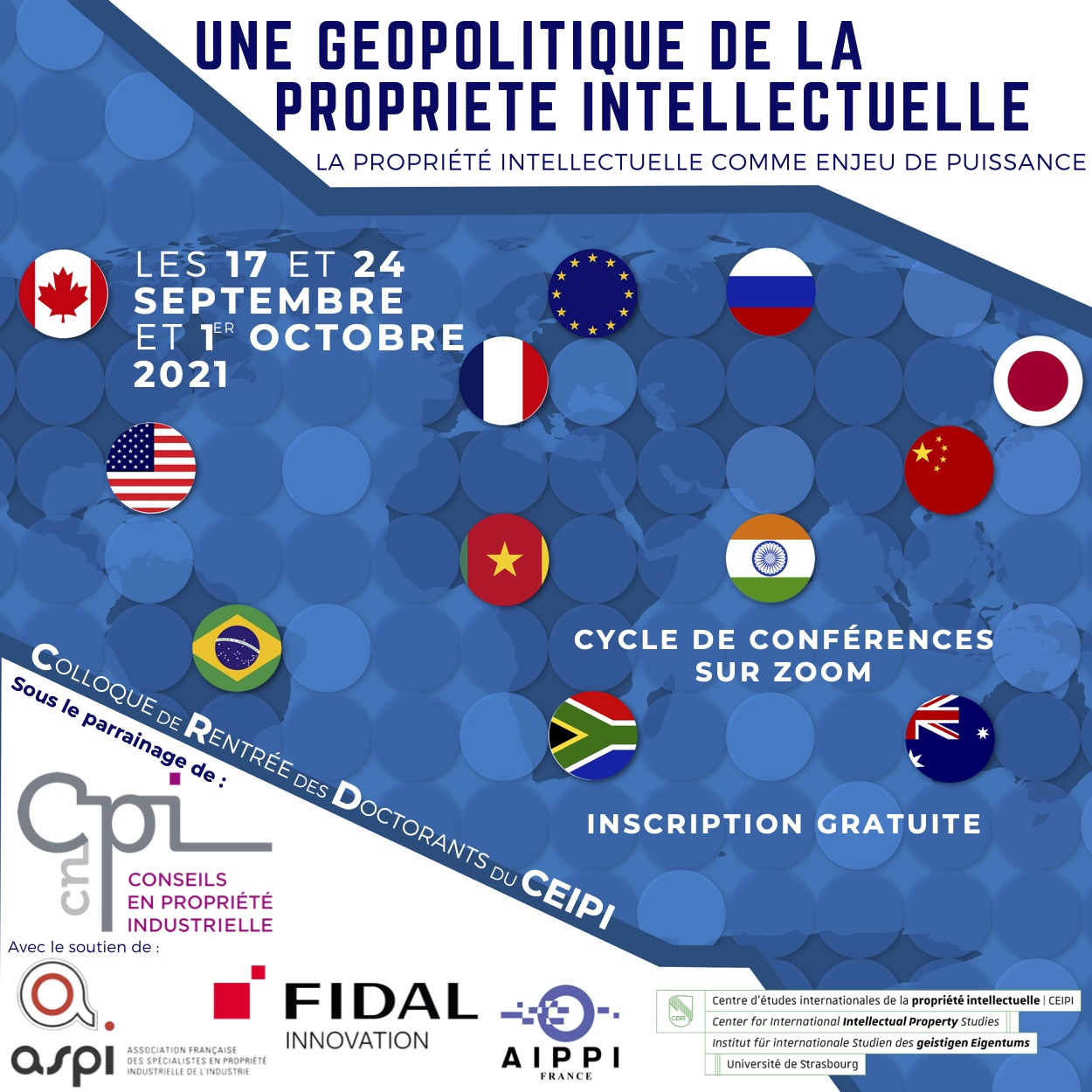 A l'occasion du cycle de conférences de rentrée du CEIPI, une conférence intitulée « Une géopolitique de la propriété intellectuelle » aura lieu le vendredi 17 septembre à 13h