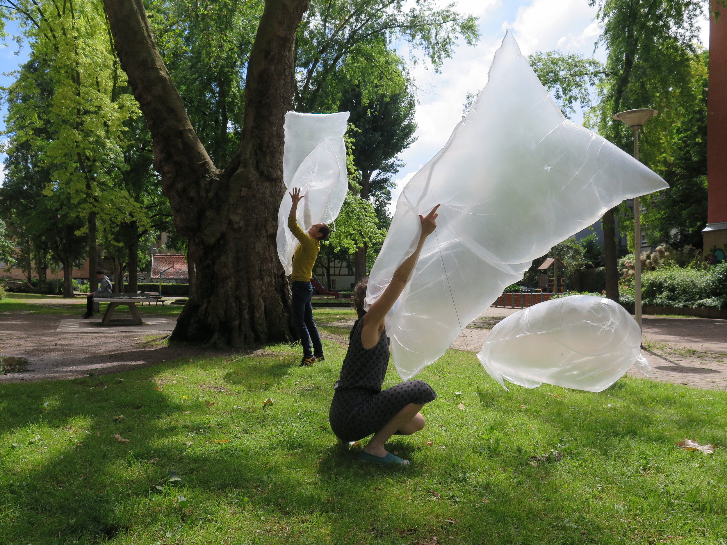 À partir de la rencontre incongrue avec ces objets aériens indéterminés, venez faire l’expérience des Flottants ! Manipuler l’air ? Oui, c’est possible. On lui fabrique une enveloppe puis on l’anime, à moins qu’il ne soit déjà en infime mouvement ? Seul.e ou à plusieurs pour éprouver la gravité de la masse, objet flottant à priori inerte, soudain comme en lévitation. Et si nous pensions les objets, les matières, les humains, non dans leurs contours mais dans la relation qu’ils entretiennent les uns avec les autres ?