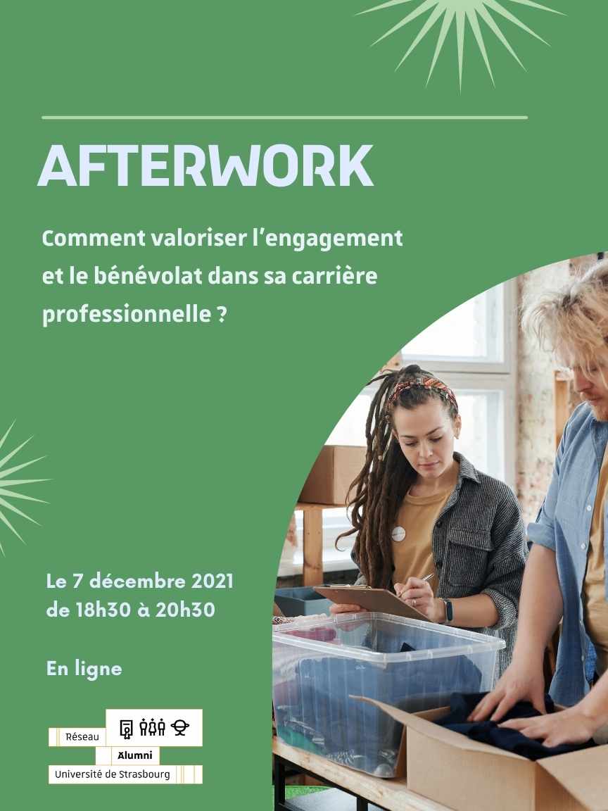 Un afterwork intitulé « Comment valoriser l'engagement et le bénévolat dans sa carrière professionnelle ? » aura lieu le mardi 7 décembre à 18h30 en ligne.
