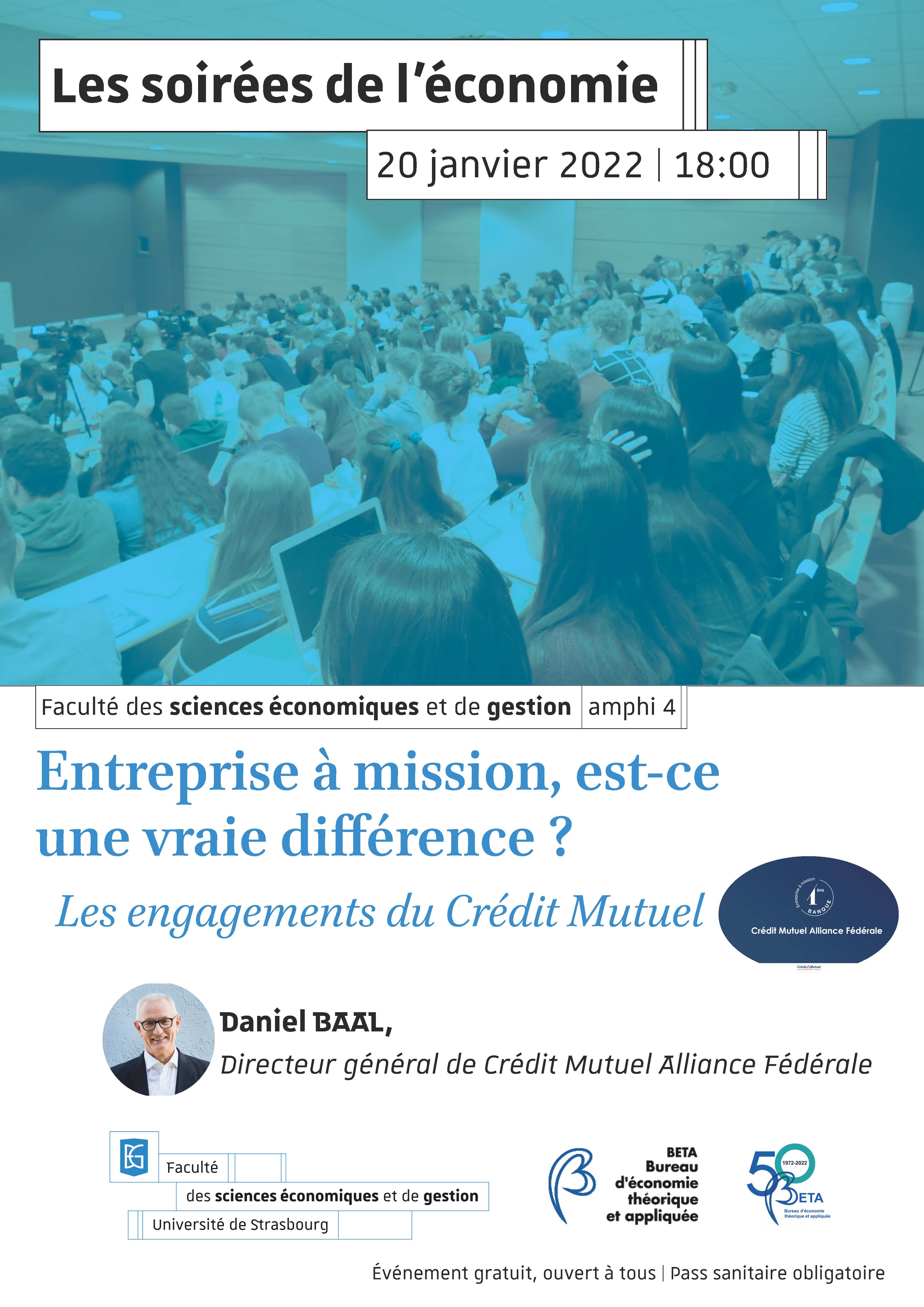 .Le 20 janvier 2022 à la Faculté de Sciences Économiques et de Gestion de Strasbourg, Daniel Baal, directeur général de Crédit Mutuel Alliance Fédérale va nous expliciter les engagements de son organisation dans le cadre de leur nouveau statut d'entreprise à mission. Y a-t-il une réelle différence ?