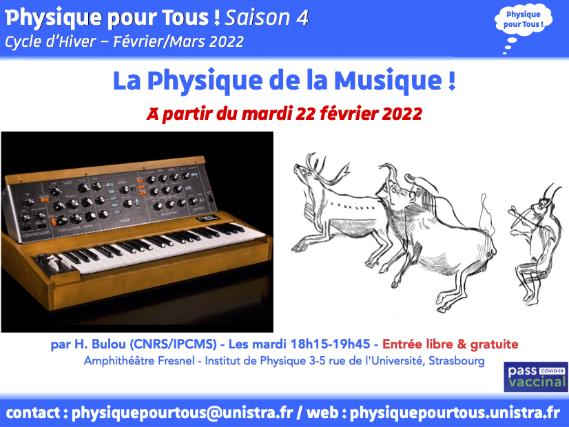 Dans le cadre du Cycle d'Hiver de Physique pour Tous !, une conférence intitulée « Physique de la Musique », Cours 1/5 « Mais qu'est-ce que c'est que ce son ? » aura lieu le mardi 22 Février 2022 à 18h15 à la Faculté de Physique & Ingénierie.