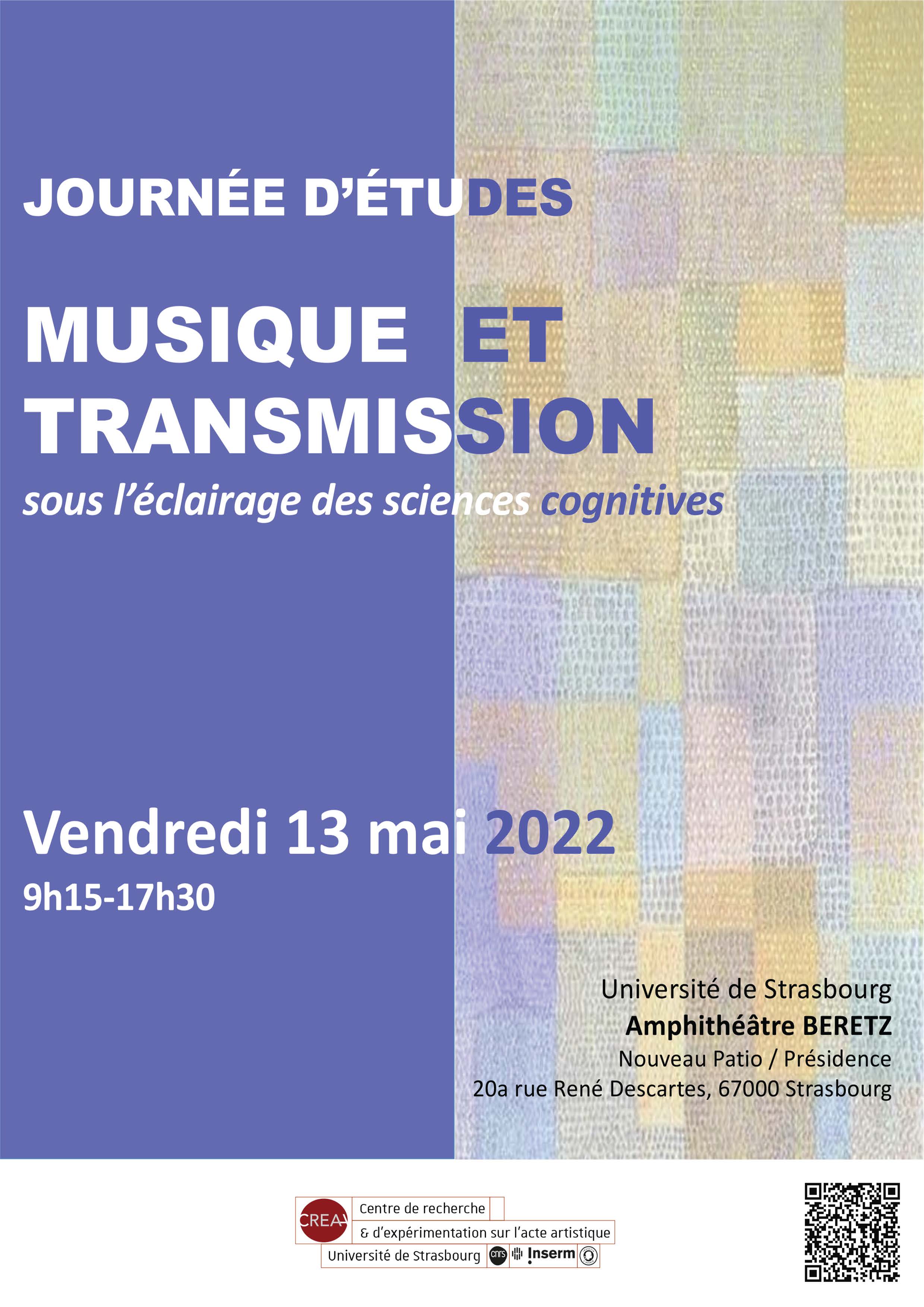 Une journée d'études intitulée « Musique et transmission sous l’éclairage des sciences cognitives » aura lieu le vendredi 13 mai à 9h au Nouveau patio sur le campus de l'Esplanade.