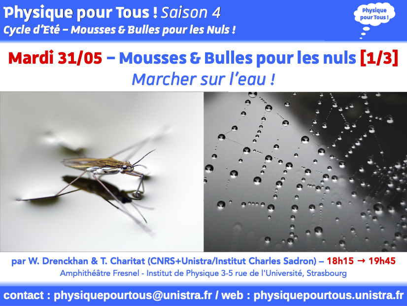 Dans le cadre du Cycle de Printemps de "Physique pour Tous !" , une conférence intitulée « Mousses & Bulles pour les nuls », Cours 1/3 « Marcher sur l’eau » aura lieu le mardi 31 mai 2022 à 18h15 à la Faculté de Physique & Ingénierie.