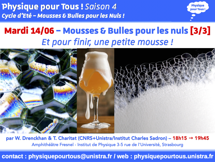 Dans le cadre du Cycle de Printemps de "Physique pour Tous !, une conférence intitulée « Mousses & Bulles pour les nuls », Cours 3/3 « Et pour finir, une petite mousse ! » aura lieu le mardi 14 Juin 2022 à 18h15 à la Faculté de Physique & Ingénierie.