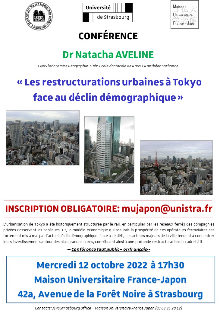 La Maison Universitaire France-Japon, en collaboration avec The Japan Society for the Promotion of Science (JSPS), a le plaisir de vous convier à la conférence du Dr Natacha Aveline, CNRS laboratoire Géographie-citéx, Ecole doctorale de Paris 1 Panthéon Sorbonne
