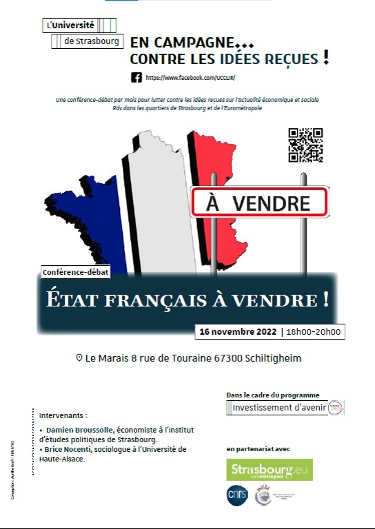 Une conférence intitulée « État français à vendre ! » aura lieu le mercredi 16 novembre à 18h au Centre socio-culturel de Schiltigheim, Le Marais.