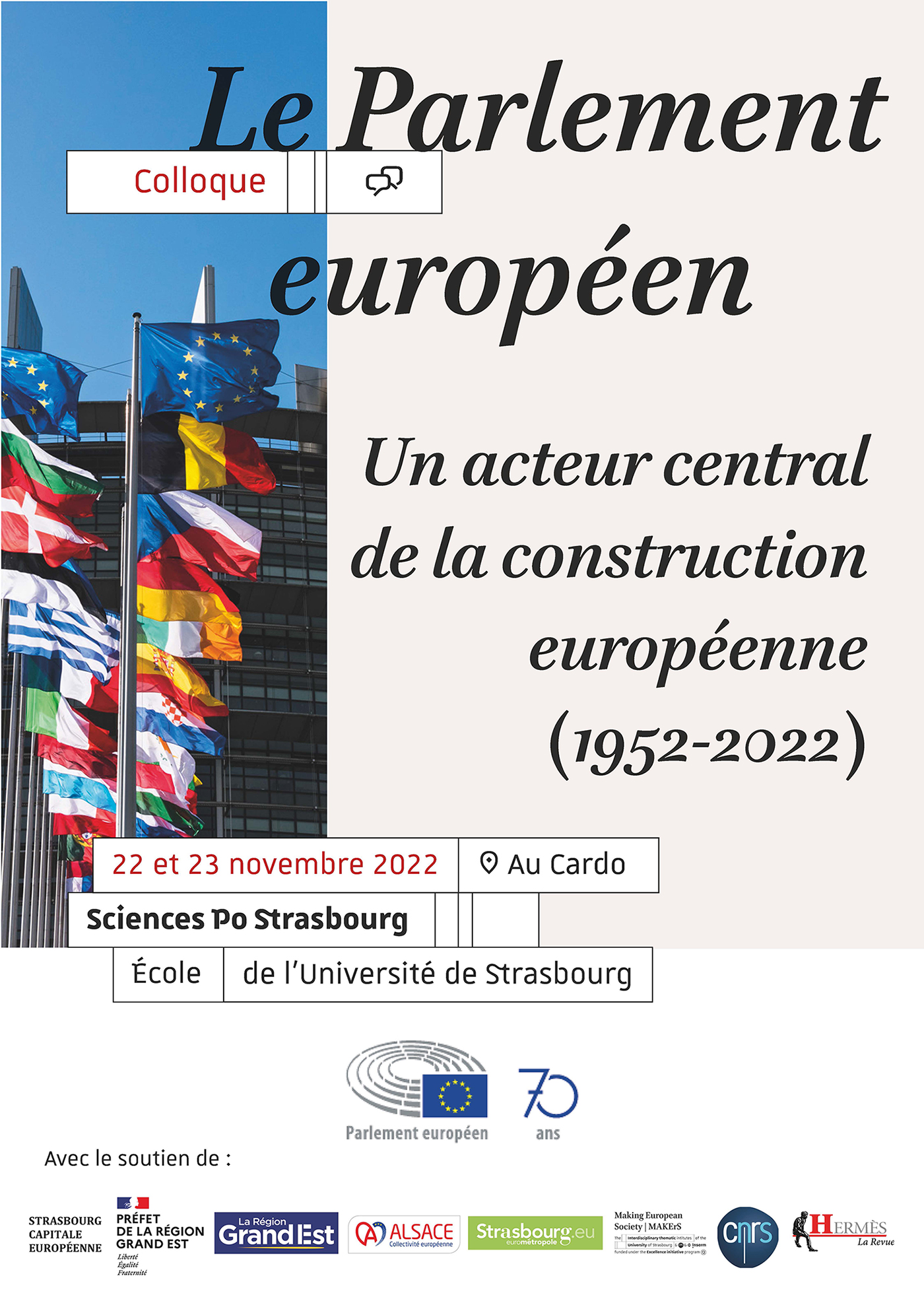 Un colloque et 5 tables rondes intitulés « Le Parlement européen, un acteur central de la construction européenne (1952 - 2022) » auront lieu au Cardo et au Palais du Rhin du mardi 22 àà 10h au mercredi 23 novembre à Sciences Po et au Palais du Rhin de Strasbourg.