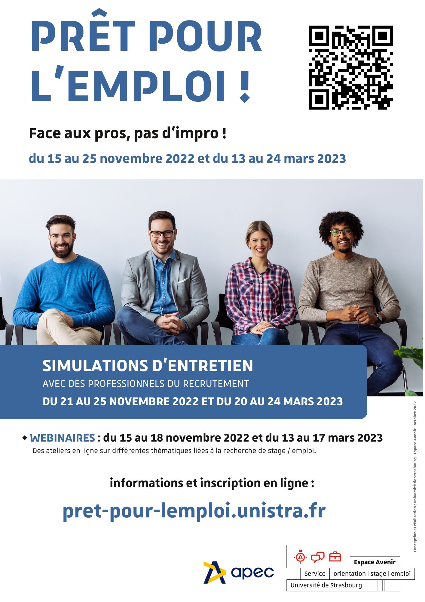 Contacts : Espace Avenir : +33 (0)3 68 85 63 00 - pret-pour-lemploi@unistra.fr