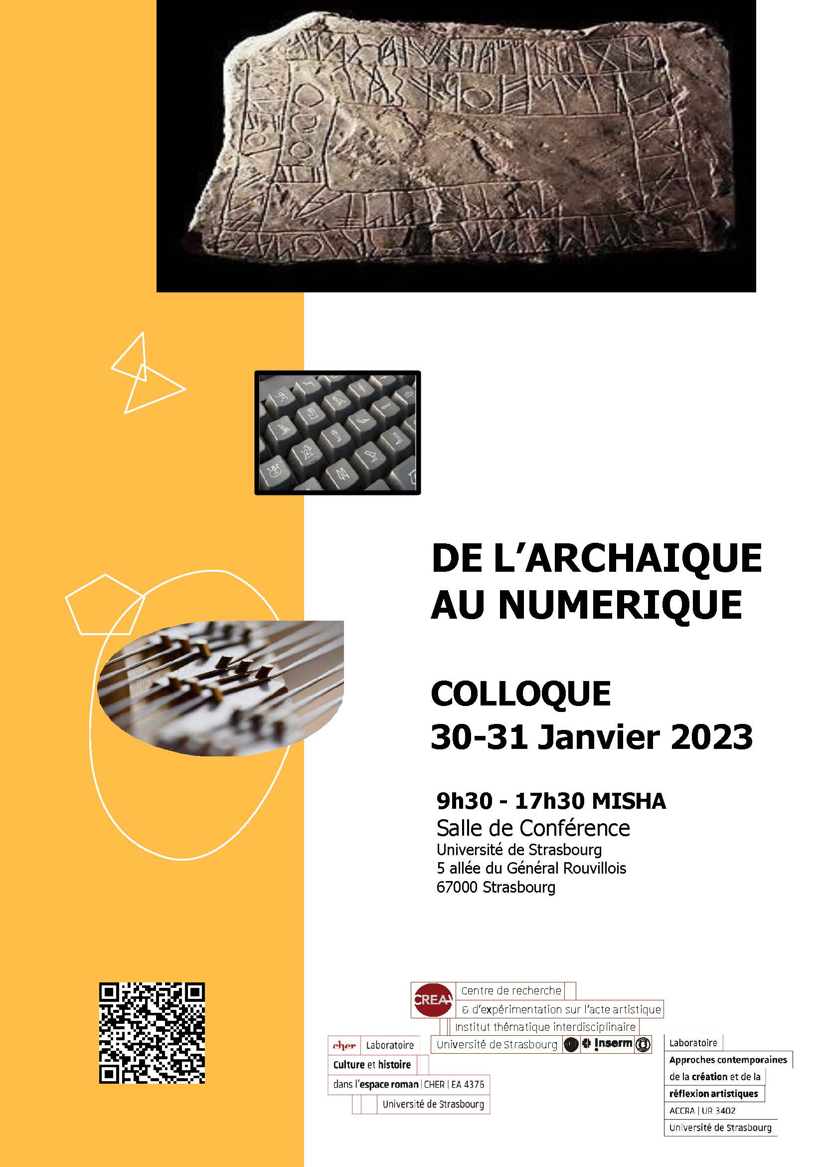 Un colloque intitulé « De l’archaïque au numérique : Parcours croisés » aura lieu le lundi 30 et mardi 31 janvier à 9h30 à la Maison Interuniversitaire des Sciences de l'Homme - Alsace (MISHA).