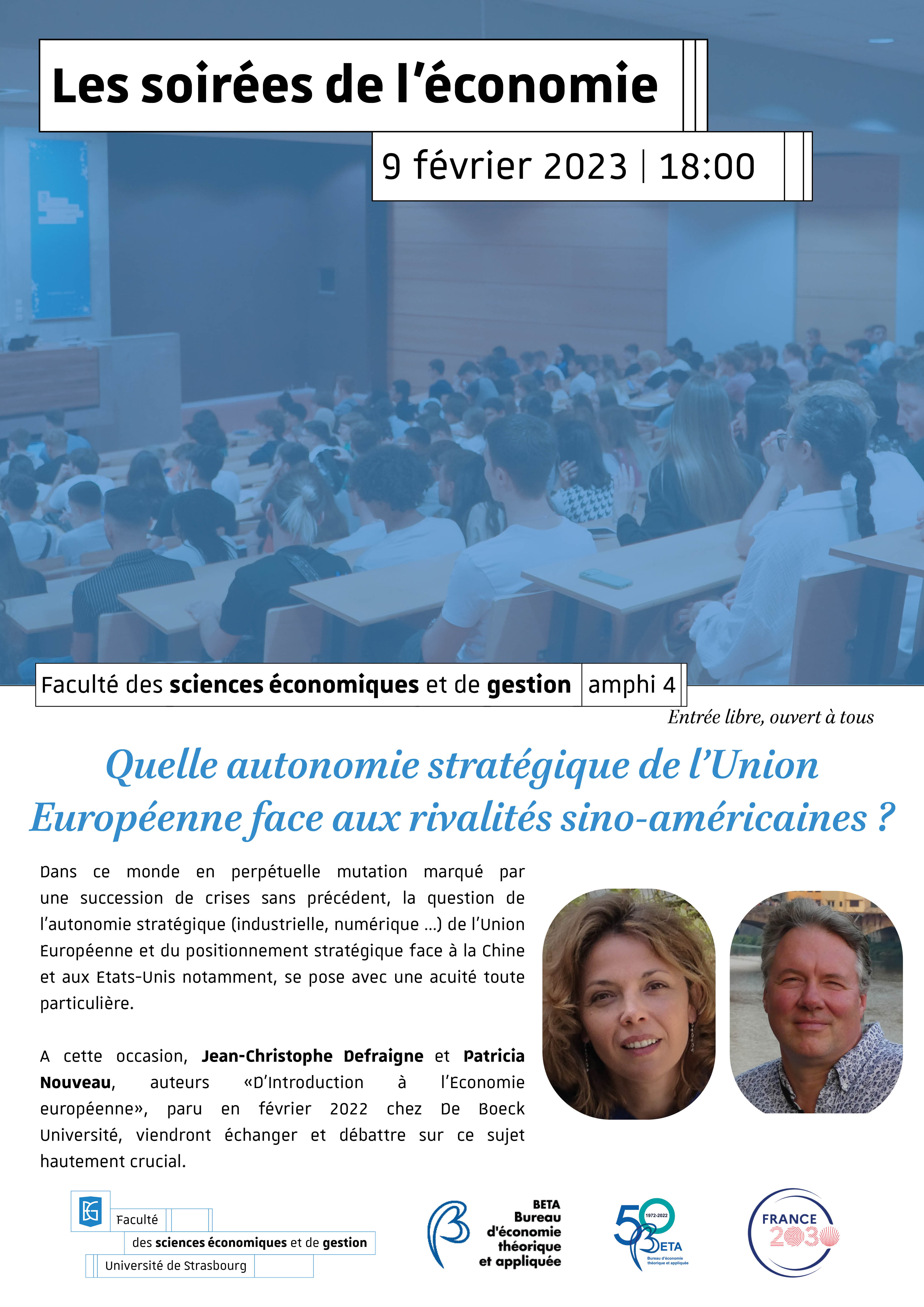 Une conférence d'actualité intitulée « Quelle autonomie stratégique de l’Union Européenne face aux rivalités sino-américaines ? » aura lieu jeudi 9 février à 18h à la Faculté de sciences économiques et de gestion de l'université de Strasbourg.
