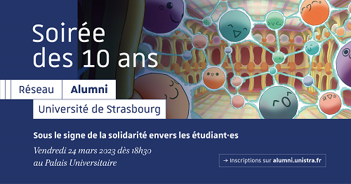 A l’occasion des 10 ans du Réseau Alumni, venez célébrer votre lien avec l’Université de Strasbourg sous le signe de la solidarité envers les étudiants.La soirée du 24 mars 2023 sera ponctuée de performances artistiques et sportives, d'échanges autour de la transmission de la recherche, de moments de retrouvailles et de rencontres privilégiées avec la grande communauté universitaire (diplômés, étudiants, personnels, donateurs, partenaires, …).