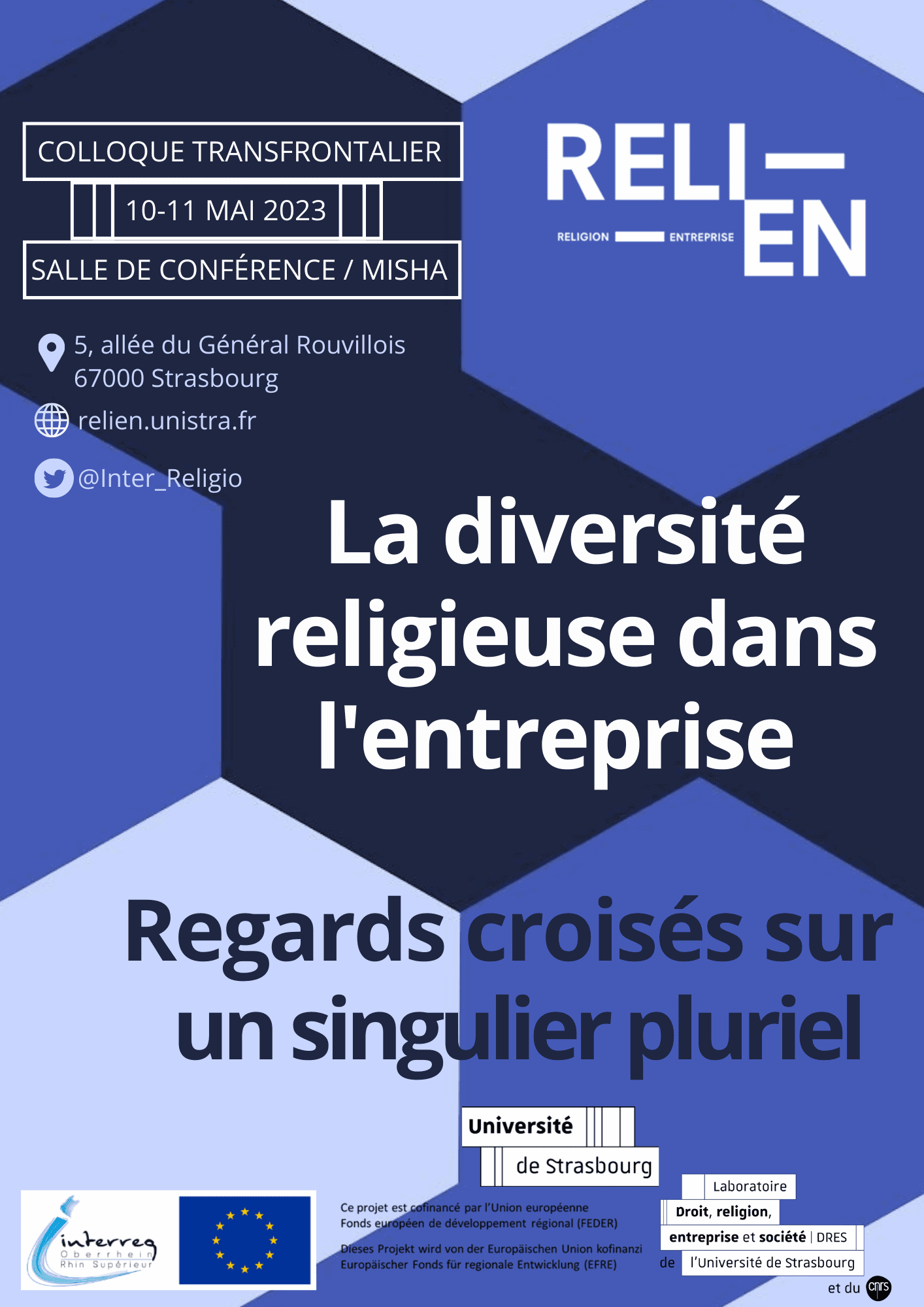 Le projet « RELIEN: Entreprise et Religion » co-financé par le programme Interreg Rhin supérieur a le plaisir de vous inviter au colloque transfrontalier intitulé « La diversité religieuse dans l'entreprise : Regards croisés sur un singulier pluriel » du mercredi 10 au jeudi 11 mai à la Maison interuniversitaire des sciences de l'homme - Alsace (MISHA).