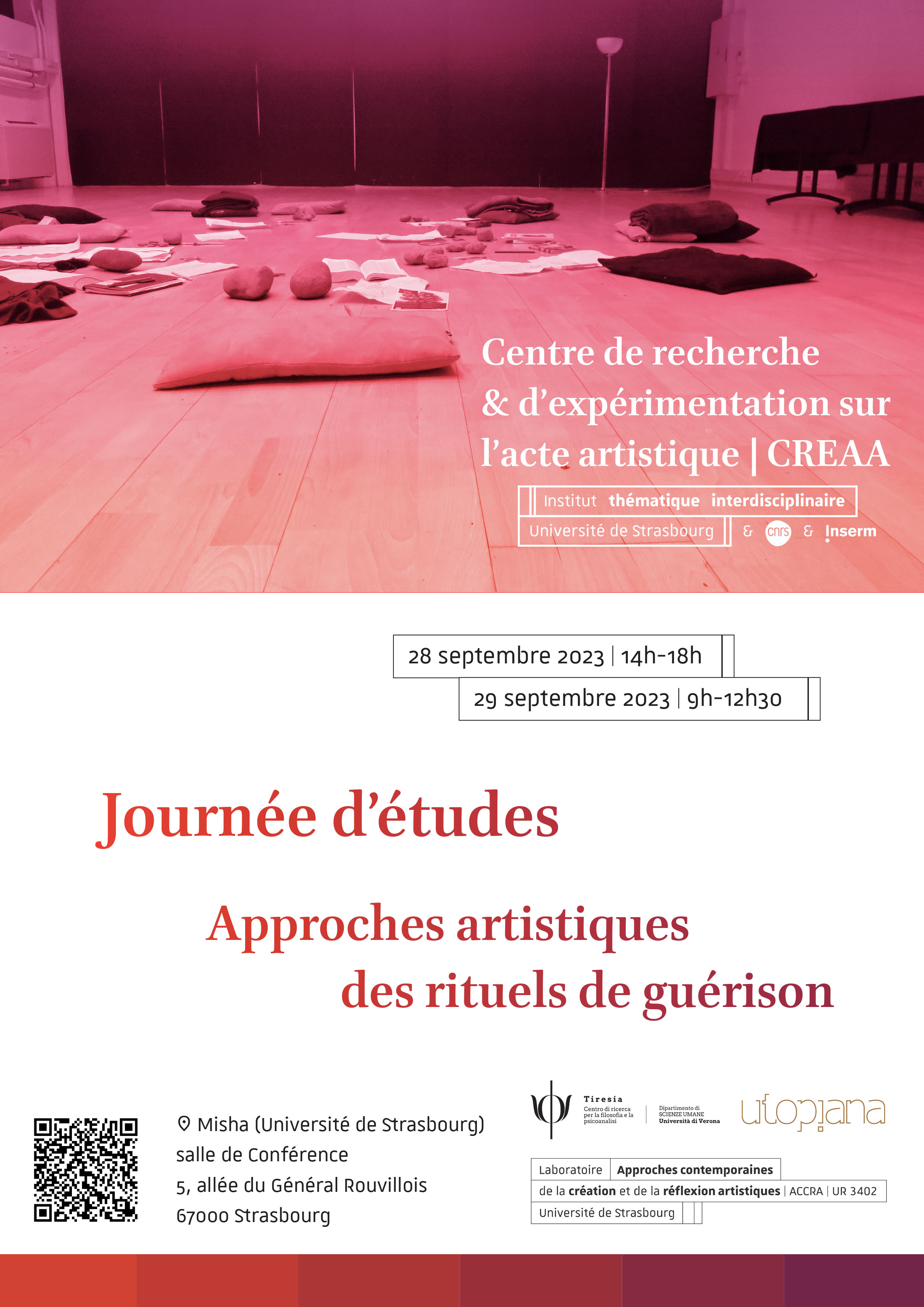 Une journée intitulée « Approches artistiques des rituels de guérison » aura lieu organisée jeudi 28 septembre à 14h à la Maison interuniversitaire des sciences de l'Homme - Alsace (Misha). Elle est organisée dans le cadre du groupe de travail « La résonance des rythmes ».