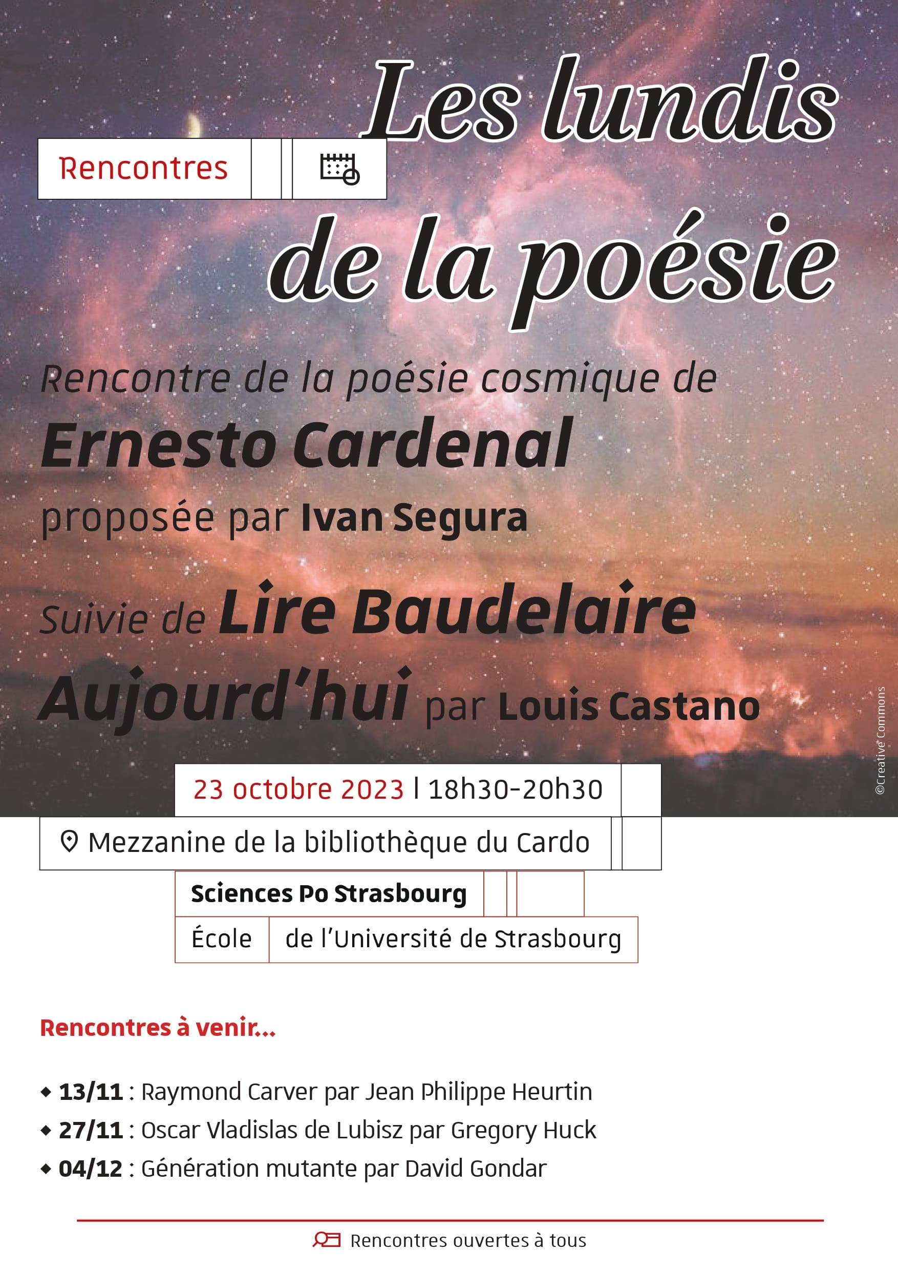 Rendez-vous le 23 octobre pour la deuxième rencontre avec Ernesto Cardenal proposée par Ivan Segura suivie de Lire Baudelaire Aujourd'hui par Louis Castano.