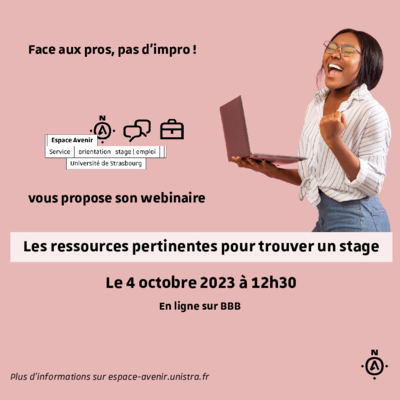 Un Webinaire intitulé « Les ressources pertinentes pour trouver un stage » aura lieu mercredi 4 octobre à 12h30.