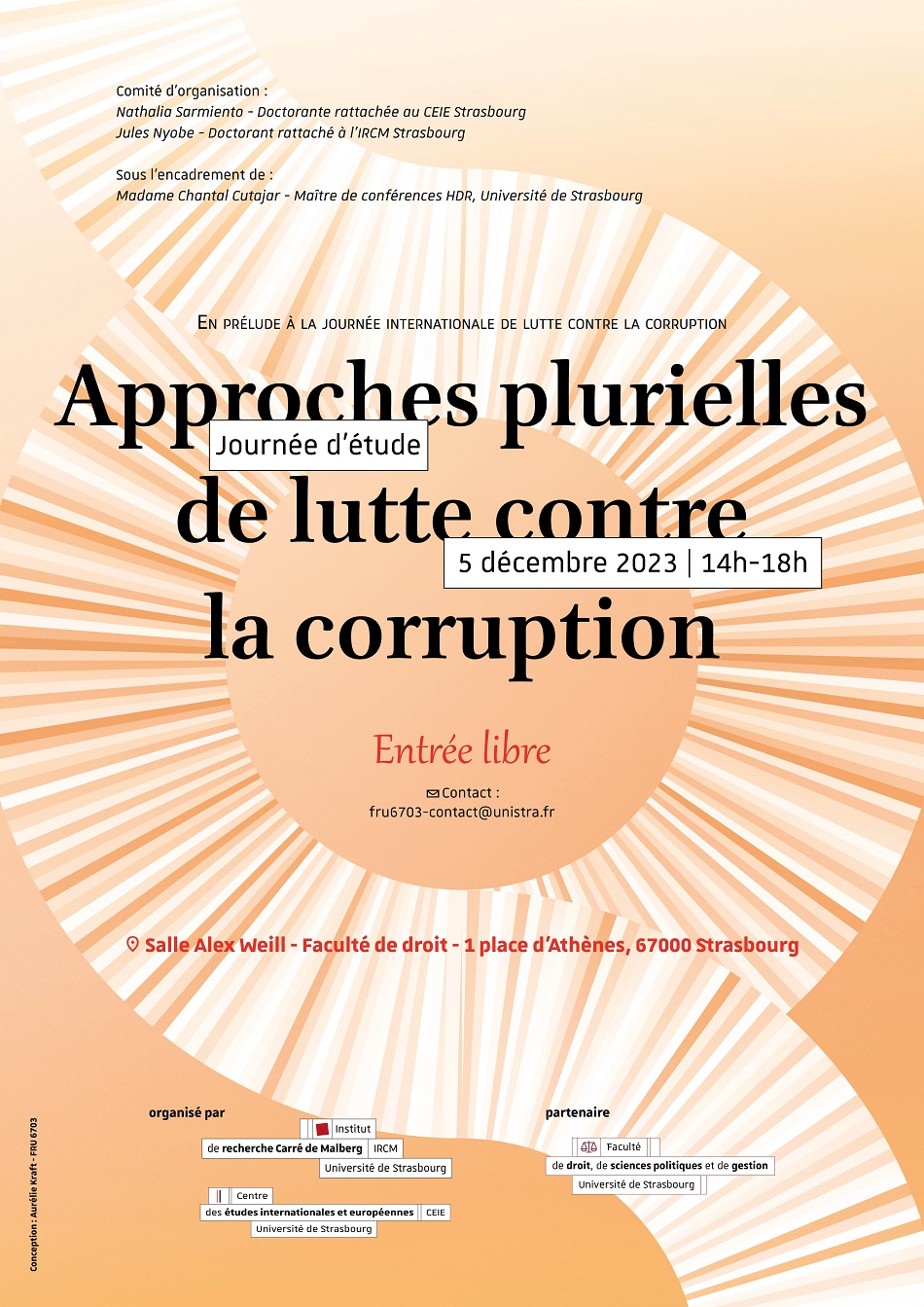 Une journée d'étude intitulée « Approches plurielles de lutte contre la corruption » aura lieu mardi 5 décembre à 14h à la Faculté de droit sur le campus de l'Esplanade. Elle intervient en prélude à la journée internationale de lutte contre la corruption (9 décembre).
