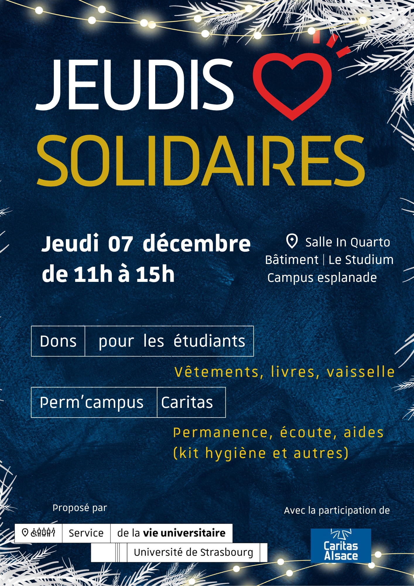 Retrouvez le prochain rendez-vous des jeudis solidaires le 07 décembre, de 11h à 15h, pour chercher son bonheur parmi les dons gratuits pour les étudiants et découvrir l'offre proposée par les Perm'campus de Caritas Alsace.