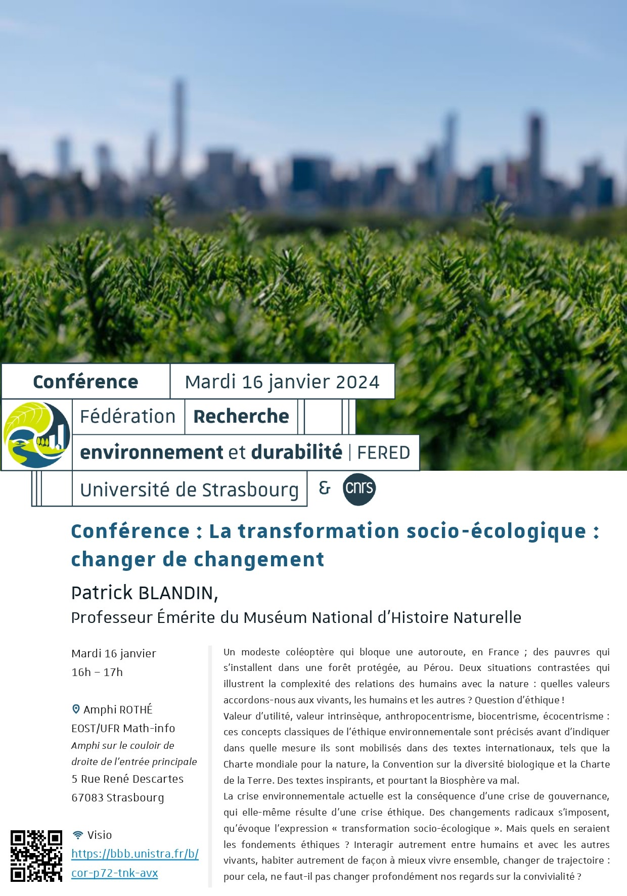 Mardi 16 janvier, Patrick Blandin, professeur émérite du Muséum national d’histoire naturelle, interviendra dans une conférence intitulée « La transformation socio-écologique : changer de changement » qui abordera l’éthique environnementale face à la crise environnementale et de gouvernance.