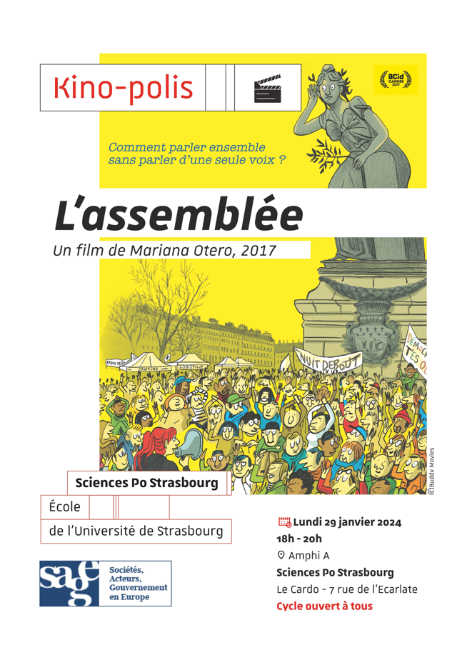 Première séance prévue le lundi 29 janvier de 18h à 20h Amphi A au Cardo - Le film "L'Assemblée" de Mariana Otero, sorti en 2017 sera projeté suivi d'un débat animé par Philippe Juhem, maître de conférences en science politique à Sciences Po Strasbourg.