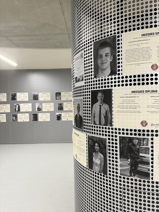 Cette exposition retrace la vie et les rêves de 40 étudiantes et étudiants ukrainiens qui ont été tués depuis le début de la guerre. Chaque diplôme, accompagné d'une photo, raconte une histoire personnelle et permet de rendre hommage à la mémoire des étudiants ukrainiens qui ne pourront jamais obtenir leur diplôme car leur vie a été emportée par la guerre.