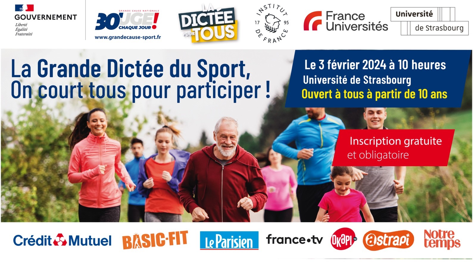 La grande dictée du sport, événement intergénérationnel ouvert à tous qui allie la passion de l’écriture à l’élan du mouvement sera de passage à l’Université de Strasbourg, partenaire de l’événement, le samedi 3 février 2024 à 10h sur le campus Esplanade. La dictée sera lue par Michel Deneken, président de l’Université de Strasbourg.