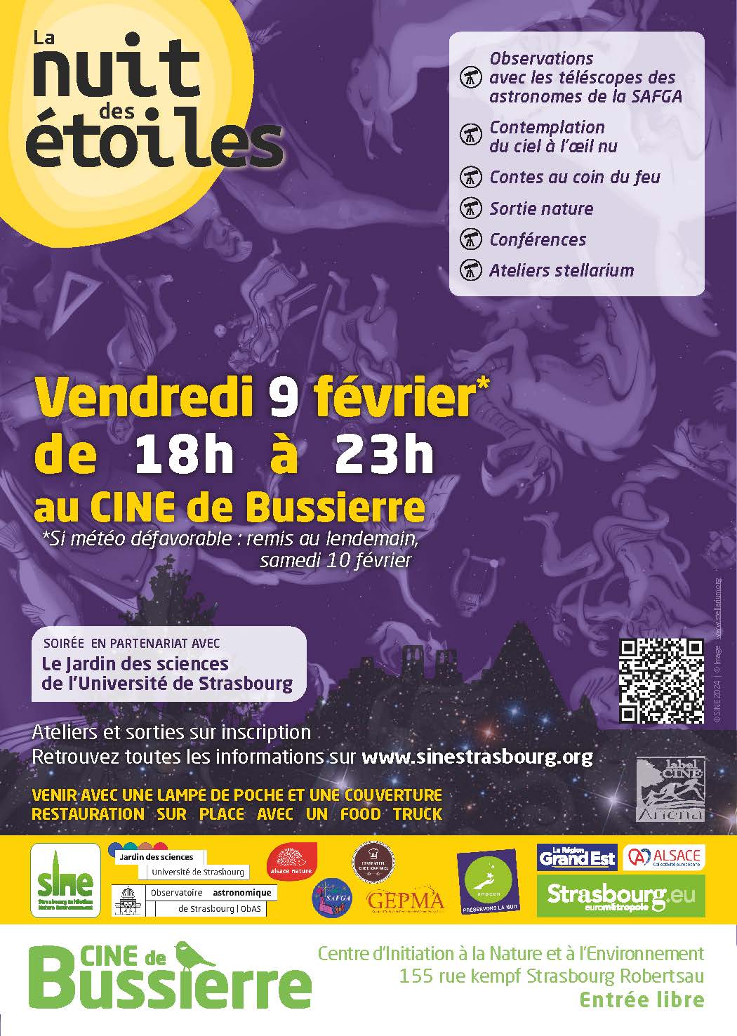 Cet hiver, découvrez le ciel étoilé à la lisière de la forêt de la Robertsau. Munis de vos vêtements les plus chauds, observez le ciel grâce à des télescopes, participez à des animations nature et des interventions autour de l’astronomie par des spécialistes.Un événement pensé en collaboration avec le CINE de Bussierre, l’Observatoire astronomique de Strasbourg et la SAFGA (Société astronomique de France Groupe Alsace).