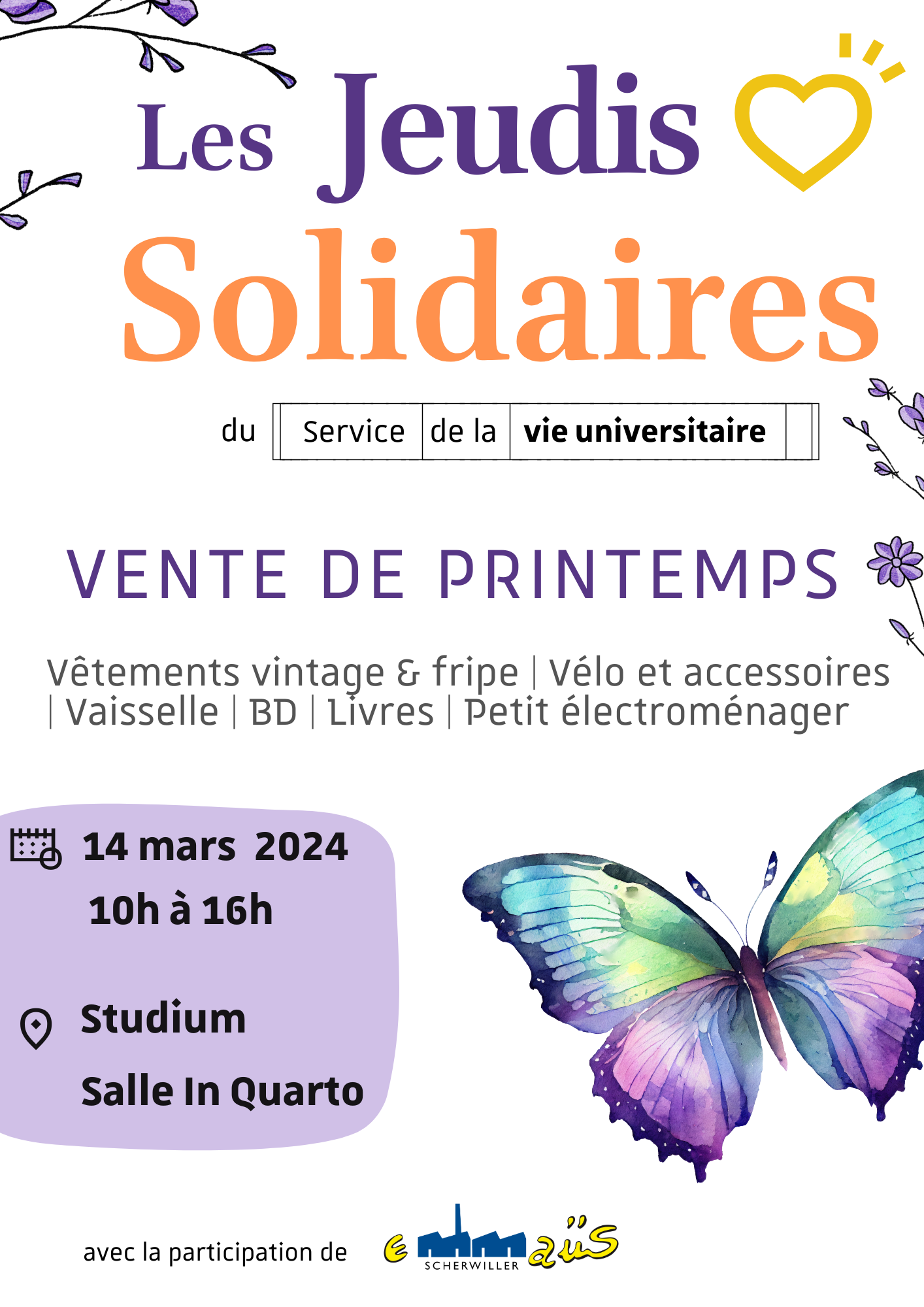 A l'occasion des Jeudis solidaires du Service de la vie universitaire | SVU, une vente de printemps est organisée jeudi 14 mars à partir 10h au Studium sur le campus de l'Esplanade.