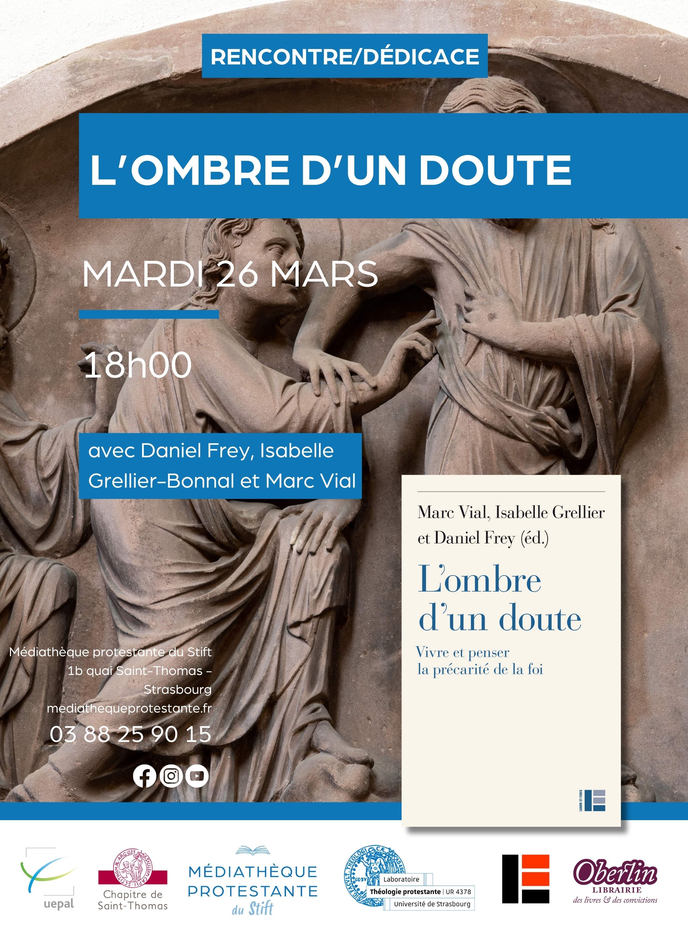 Une Rencontre / Dédicace intitulée « L'Ombre d'un doute. Vivre et penser la précarité de la foi » aura lieu mardi 26 mars à 18h à la médiathèque protestante.