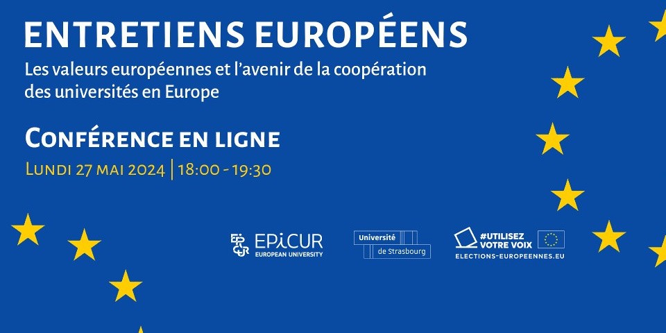 Dans le cadre des élections européennes, l'Université de Strasbourg a le plaisir de vous inviter à une web-conférence intitulée « L'avenir de la coopération des universités en Eruope » lundi 27 mai à 18h. Pour débattre avec des chercheurs sur les valeurs européennes.