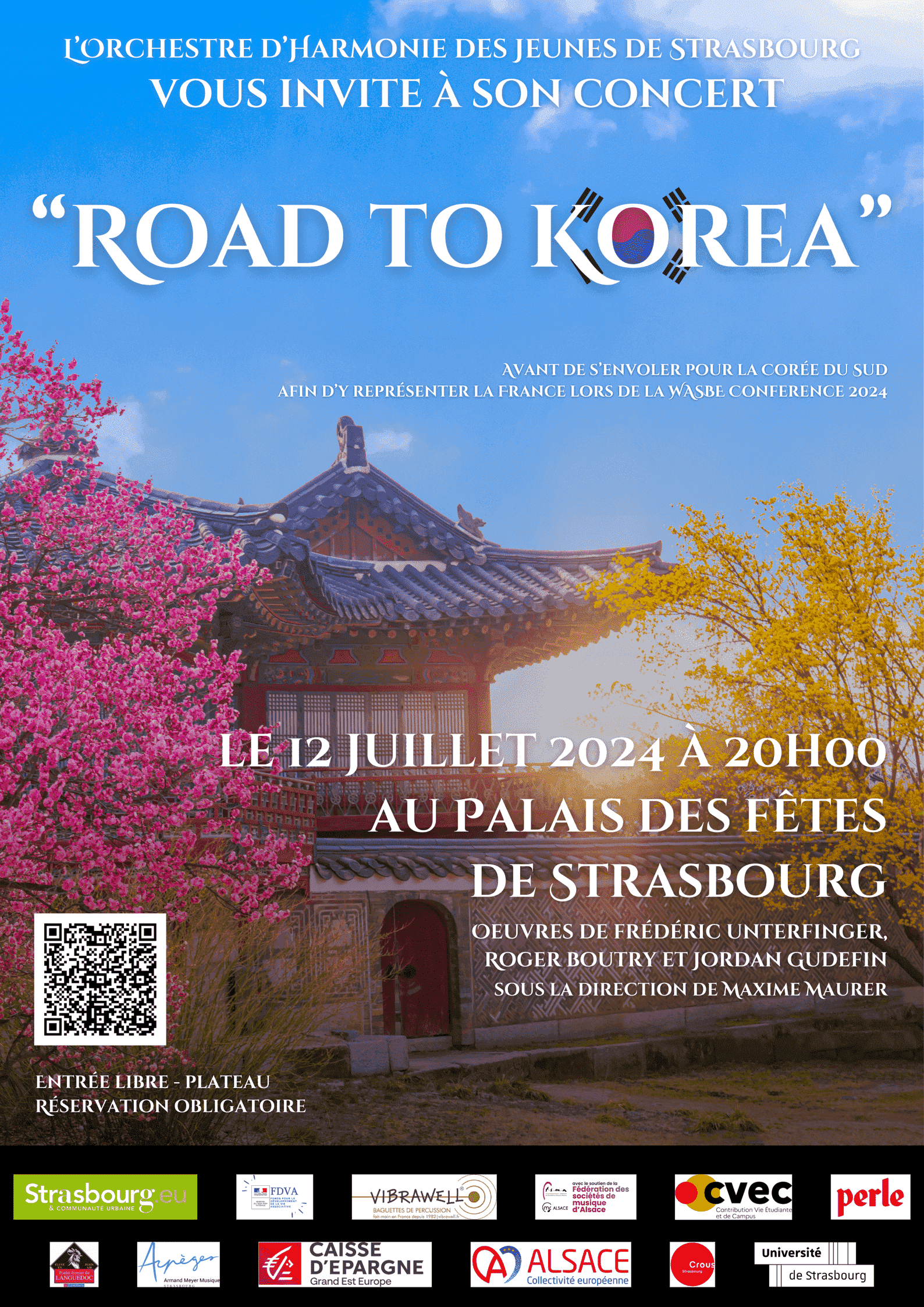 L'Orchestre d'Harmonie des Jeunes de Strasbourg (OHJS) vous invite à son prochain concert Road to Korea le vendredi 12 juillet 2024 à 20h au Palais des fêtes de Strasbourg, 2 jours avant de s'envoler en Corée du Sud pour représenter la France, l'Alsace et l'Université de Strasbourg lors de la WASBE* Conference. (*World Association for Symphonic Bands and Ensembles, association mondiale des orchestres d'harmonie).
