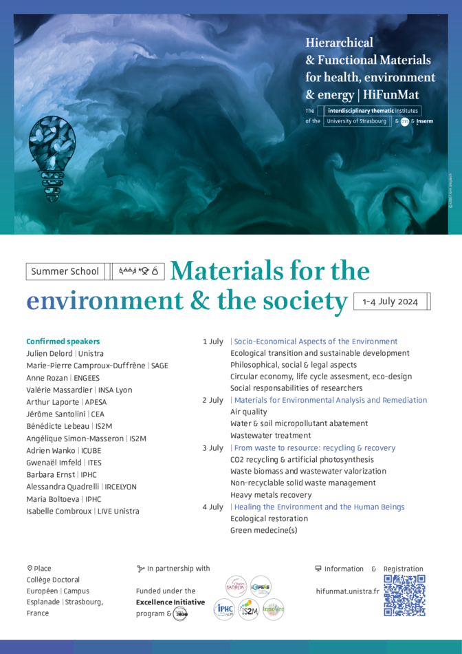 L'Institut Thématique Interdisciplinaire pour les Matériaux Hiérarchiques et Fonctionnels | ITI HiFunMat, organise une école d'été du 1er au 4 juillet 2024, sur le thème des « Matériaux pour l'environnement et la société ».