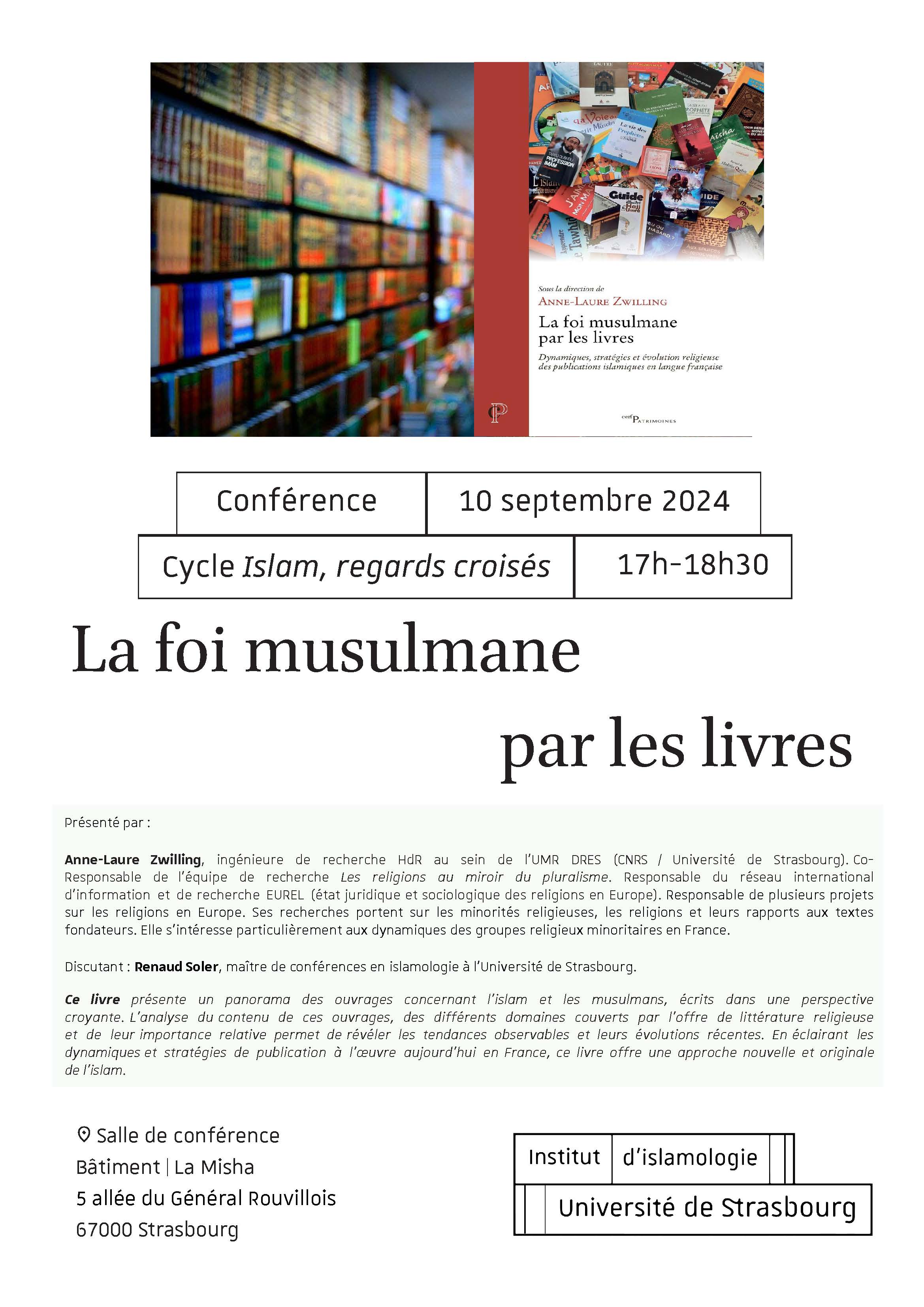 Dans le cadre du cycle de conférences Islam - Regards croisés, l'Institut d'islamologie de l'Université de Strasbourg  a le plaisir de vous inviter à la conférence intitulée « La foi musulmane par les livres. Dynamiques, stratégies, et évolution religieuse » qui aura lieu mardi 10 septembre à 17h à la Maison interuniversitaire des sciences de l'Homme - Alsace (Misha).
