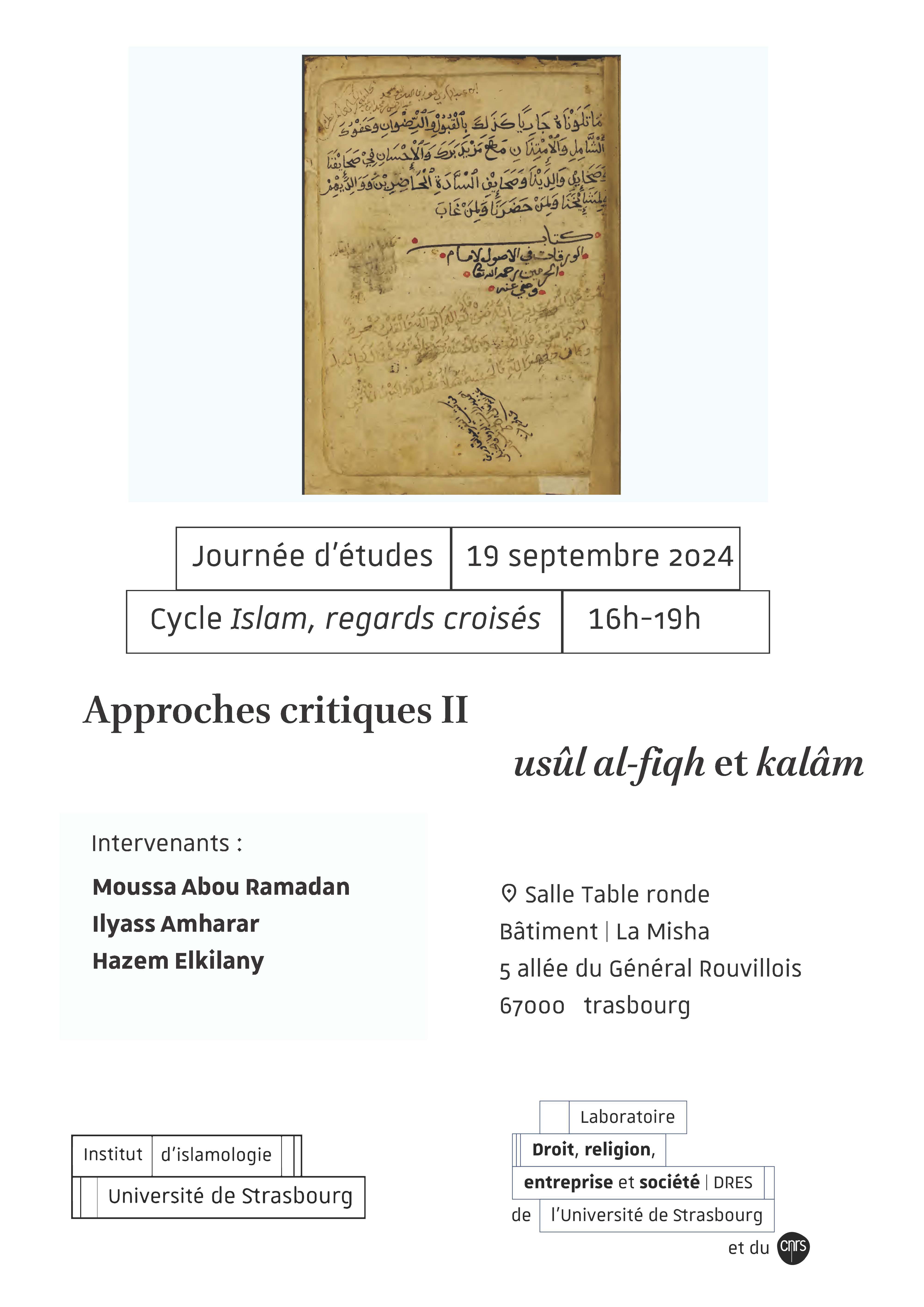Une journée d'études intitulée « Approches critiques II - Usûl al-fiqh et kalâm » aura lieu jeudi 19 septembre à 16h à la Maison interuniversitaire des sciences de l'Homme - Alsace (Misha)
