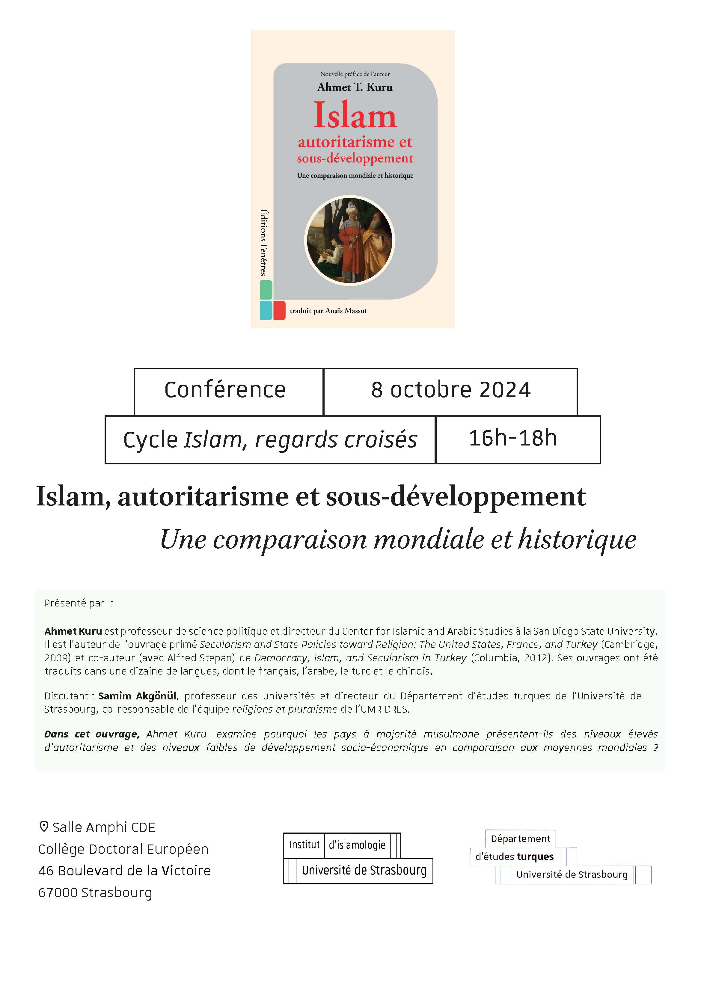 Dans le cadre de ses manifestations scientifiques, le Département d'études turques et l'Institut d'islamologie de l'Université de Strasbourg organisent une conférence le mardi 8 octobre de 16h à 18h autour de l'ouvrage : Islam, autoritarisme et sous-développement. Une comparaison mondiale et historique. La session sera animée par les professeurs Ahmet Kuru, auteur de l'ouvrage et Samim Akgönül qui interviendra en tant que discutant.