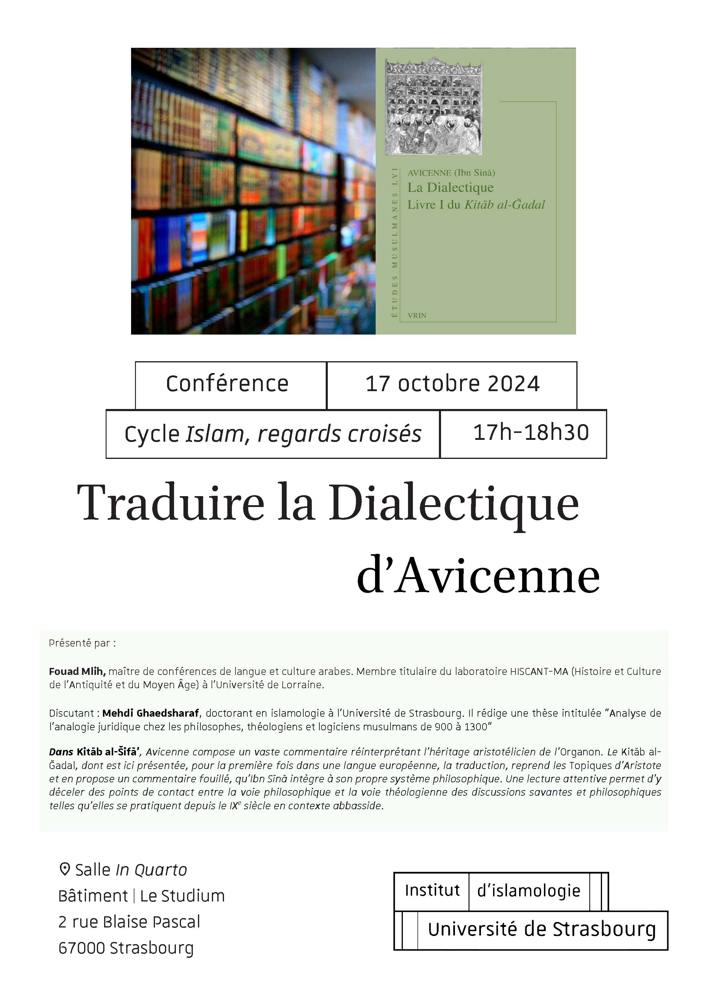Dans le cadre du cycle de conférences Islam, regards croisés, l'Institut d'islamologie de l'université de Strasbourg organise le jeudi 17 octobre de 17h à 18h30 une conférence intitulée « Traduire la Dialectique d’Avicenne » au Studium.