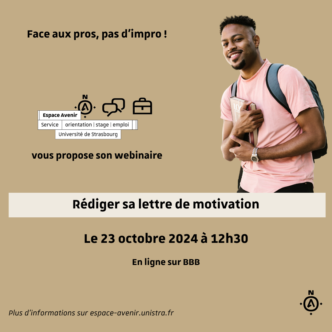 Un Webinaire intitulé « Rédiger sa lettre de motivation » aura lieu mercredi 23 octobre à 12h30.