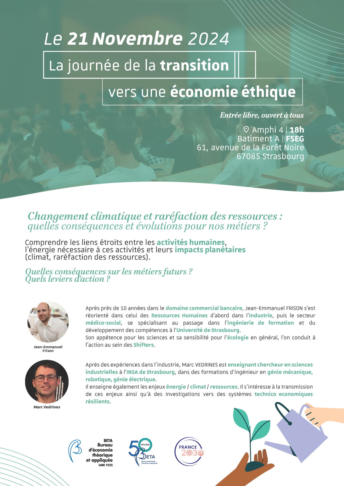 Pour cette nouvelle édition des Soirées de l'économie de la Faculté des sciences économiques et de gestion nous aurons le plaisir d'accueillir Jean-Emmanuel Frison & Marc Vedrines, spécialistes des questions liées au changement climatique et ses conséquences, qui apporteront leur expertise le temps de cette conférence