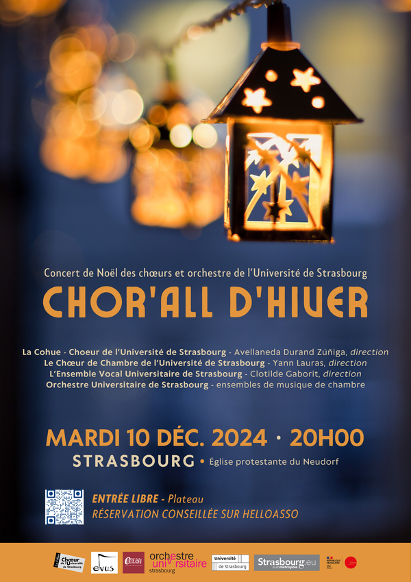 L'ensemble vocal universitaire de Strasbourg, la Cohue, le cœur de chambre et l'orchestre universitaire sont heureux de vous inviter à leur concert de Noël intitulé Chor'All d'hiver avec 150 choristes et musiciens sur scène !
