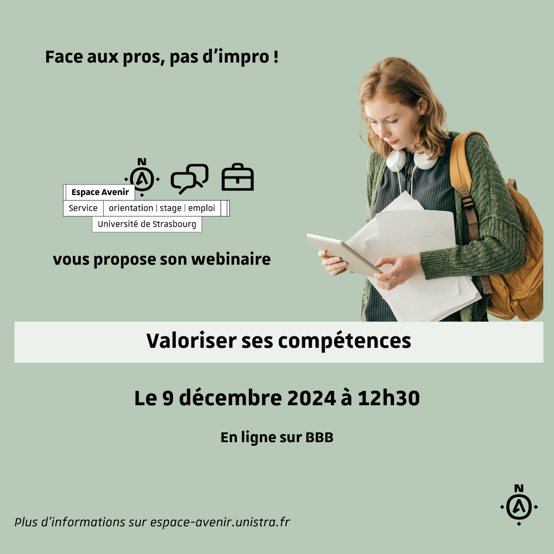 Un webinaire intitulé « Valoriser ses compétences » aura lieu lundi 9 décembre à 12h30.