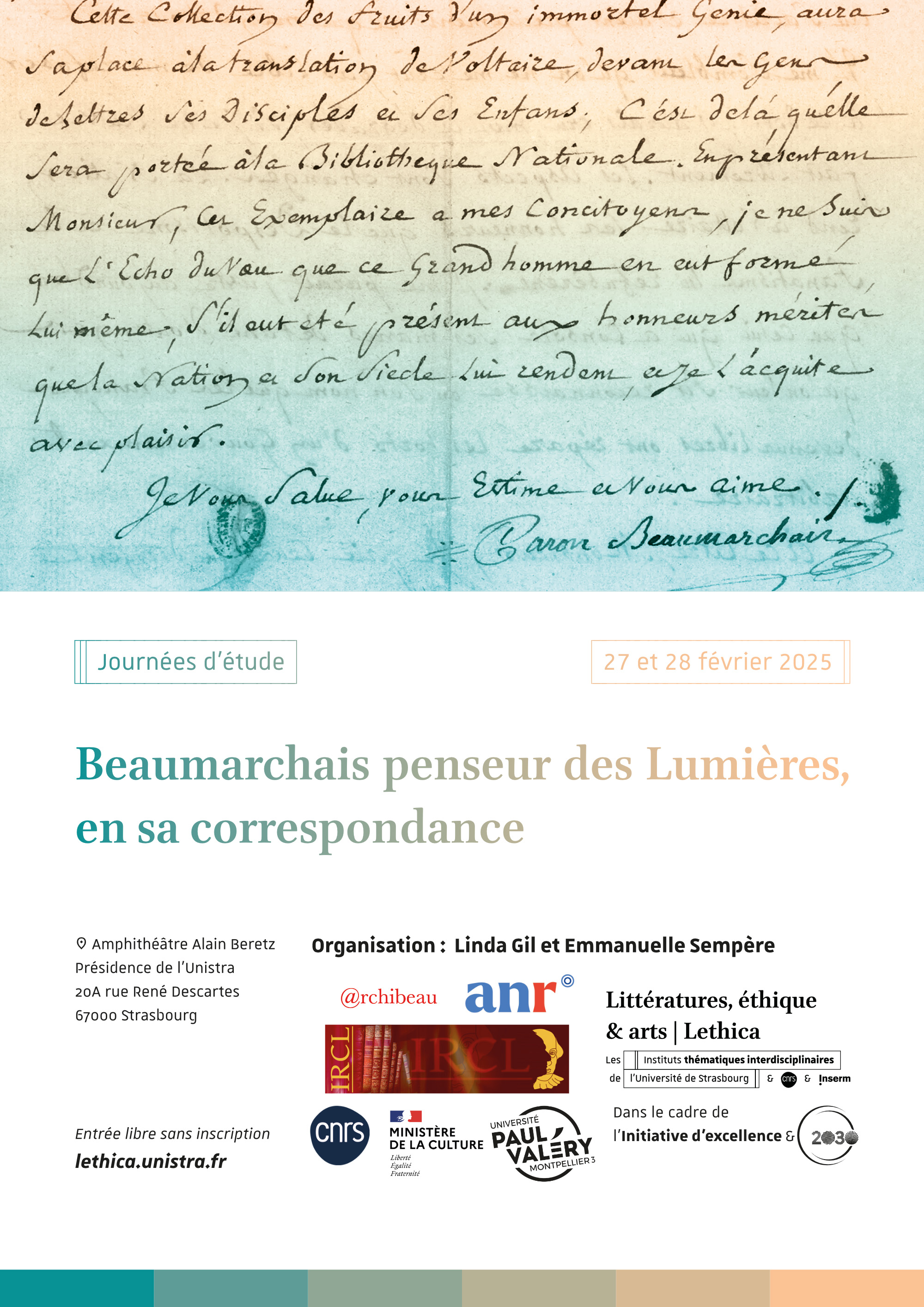 Journées d’étude organisées par l’Institut de recherche sur la Renaissance, l’âge Classique et les Lumières (IRCL, UMR 5186 du CNRS, Université Paul-Valéry Montpellier et Ministère de la Culture), en partenariat avec l'ITI Lethica, Institut Thématique Interdisciplinaire labellisé par l'Université de Strasbourg, le CNRS et l'Inserm, dans le cadre du programme ITI 2021-2028, avec le soutien de l'ANR : Projet @rchibeau (Archives numériques de la correspondance et des papiers manuscrits de Beaumarchais)