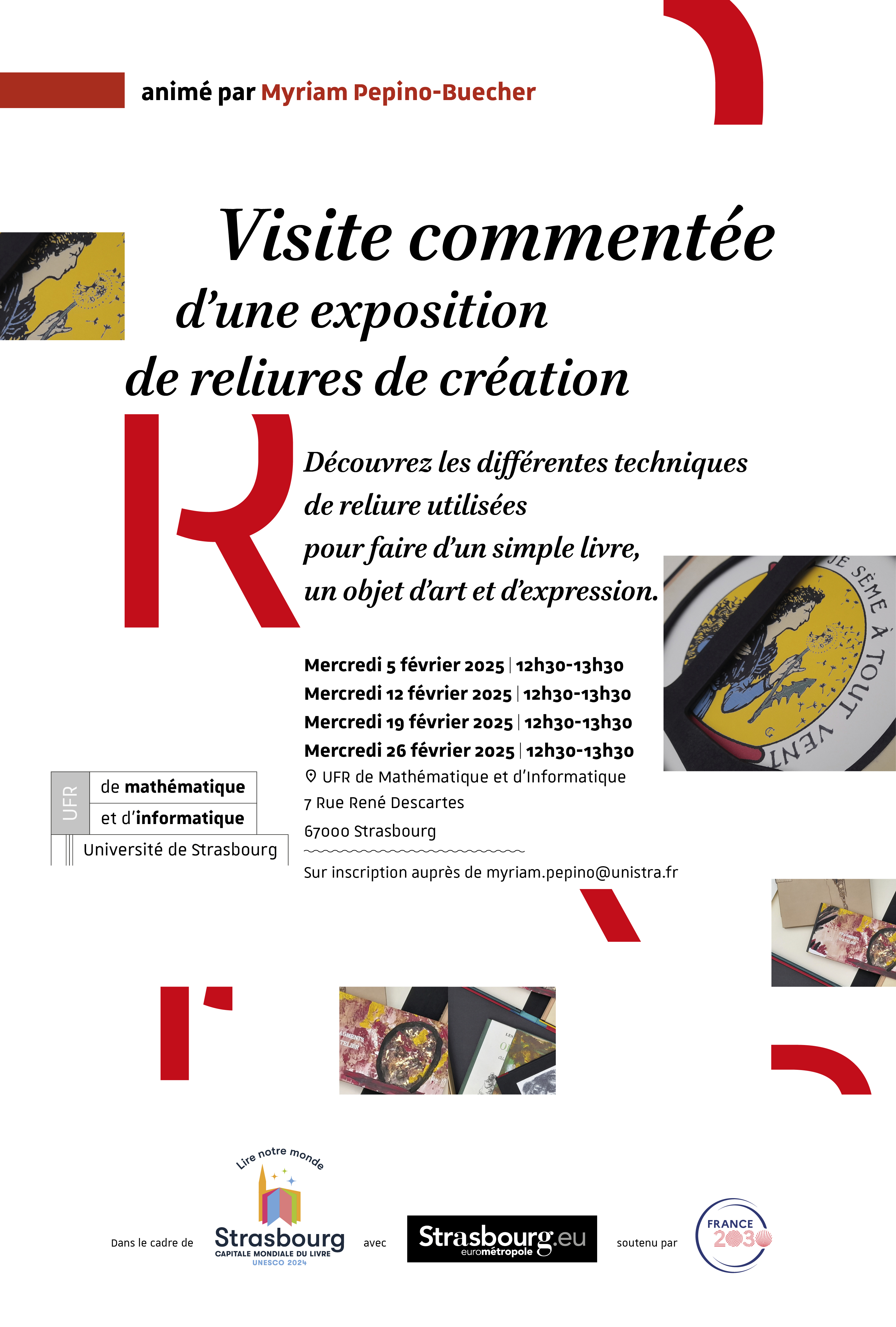 Une visite commentée d’une exposition de reliures de création aura lieu mercredi 12 février à 12h30 à l'UFR de mathématique et informatique sur le campus de l'Esplanade.