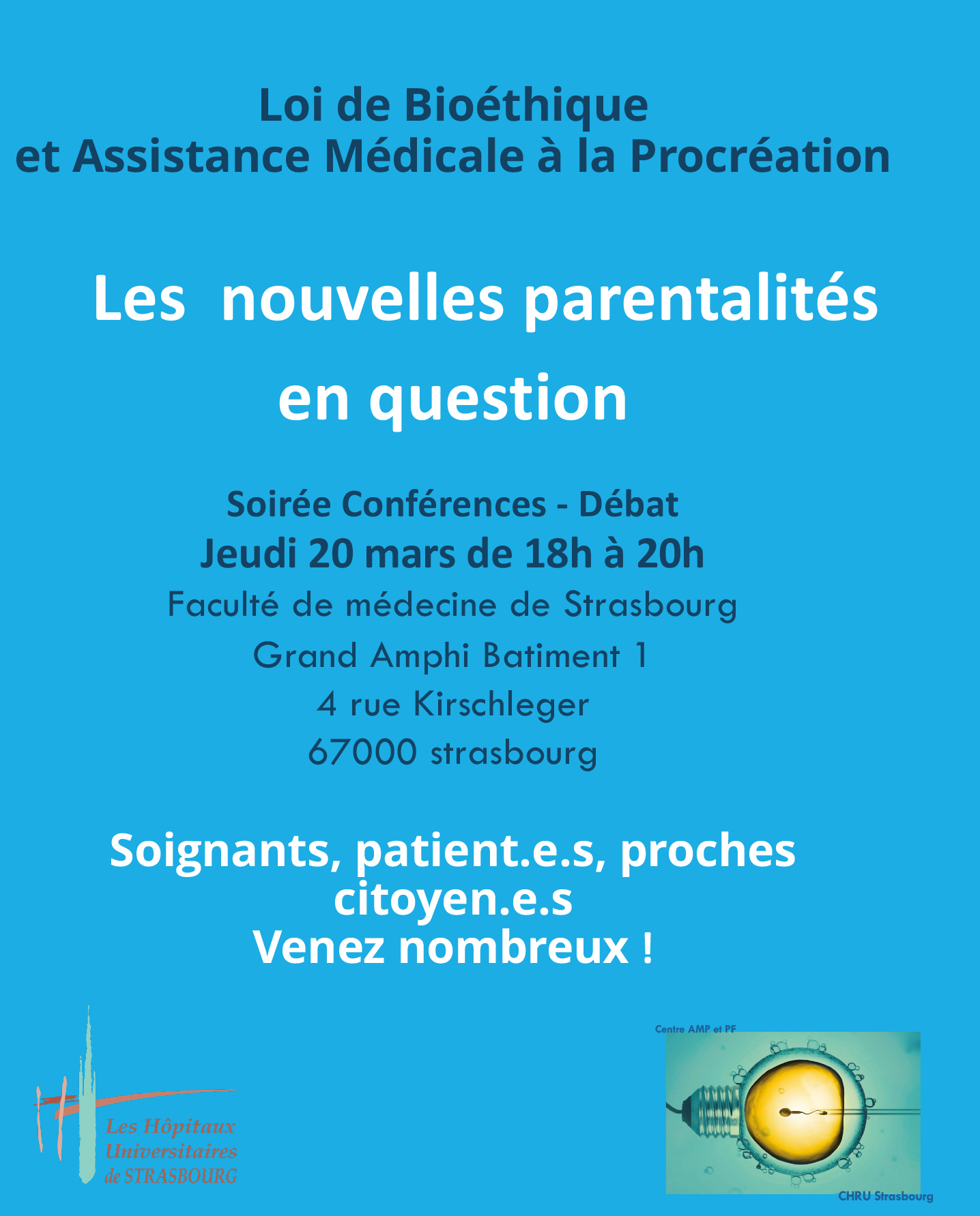 Une conférence intitulée « Loi de Bioéthique et Assistance Médicale à la Procréation - Les nouvelles parentalités en question » aura lieu jeudi 20 mars à 18h à la Faculté de médecine.
