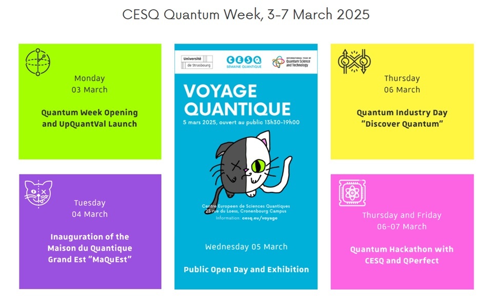 Dans le cadre de l'Année internationale des sciences et technologies quantiques proclamée par les Nations Unies, le Centre européen de sciences quantiques (CESQ) de l'Université de Strasbourg et du CNRS organise une série d'événements intitulé « Partez à la découverte des mystères des sciences quantiques ! » durant la semaine du lundi 3 au vendredi 7 mars 2025 dans ses locaux, sur le Campus de Cronenbourg.