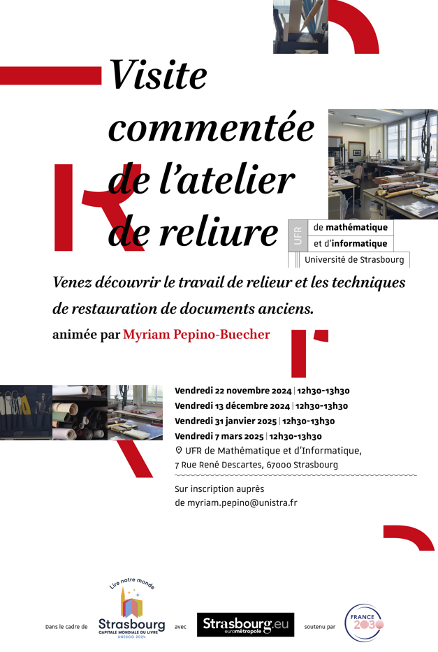 Une visite commentée de l'atelier de reliure aura lieu vendredi 7 mars à 12h30 à l'UFR de Mathématique et d’Informatique sur le campus de l'Esplanade.