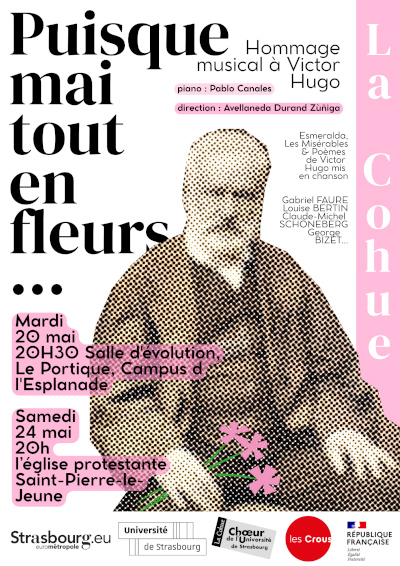 Le Chœur de l’Université de Strasbourg – La Cohue vous invite à un concert intitulé « Puisque Mai tout en fleurs... » mardi 20 mai au Portique sur le campus de l'Esplanade ainsi que samedi 24 mai à 20h00 à l’église protestante de Saint-Pierre-le-Jeune, place Saint-Pierre-le-Jeune à Strasbourg.