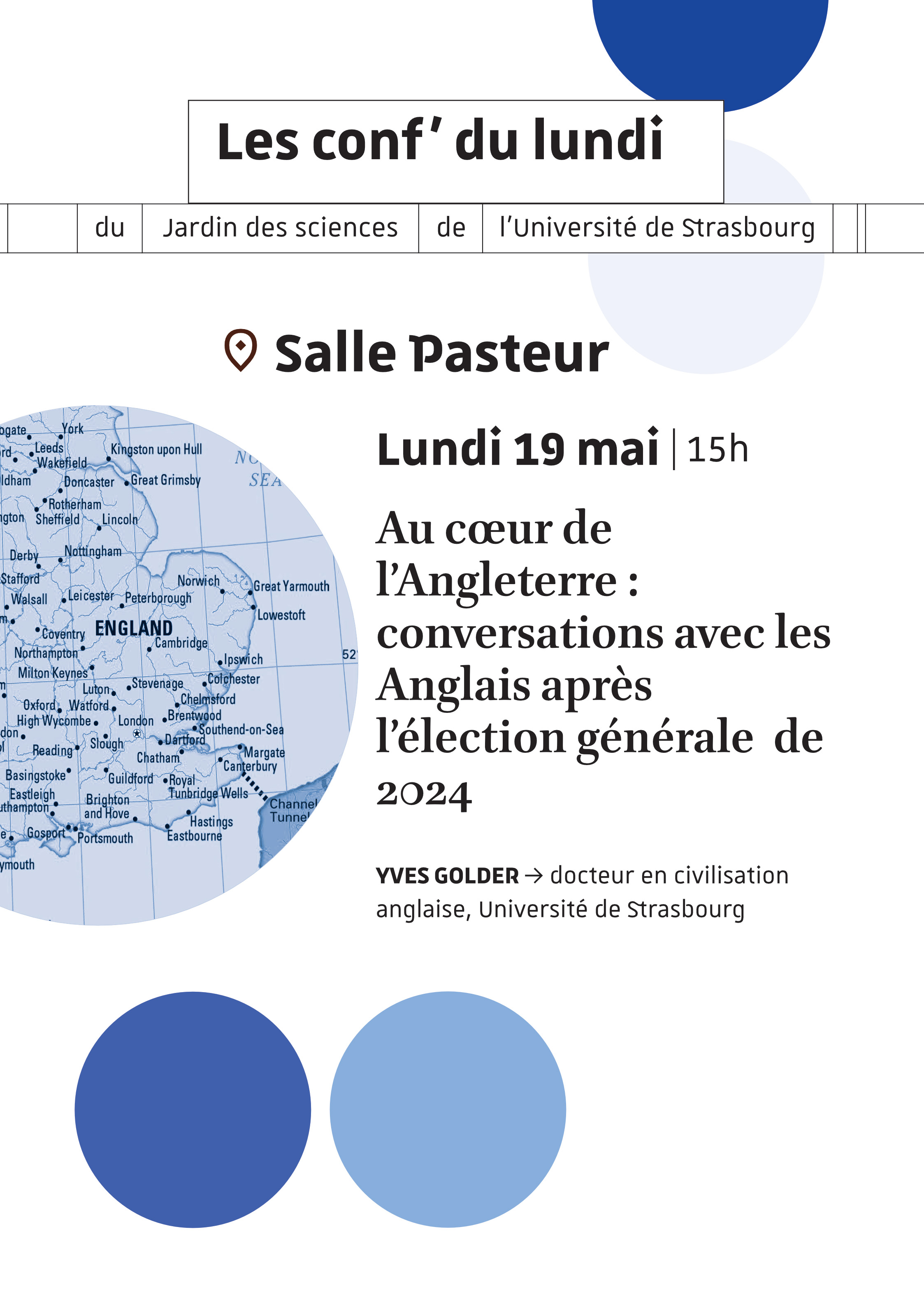 Dans le cadre des Conf' du lundi, une conférence intitulée « Au cœur de l’Angleterre : conversations avec les Anglais après l’élection générale de 2024 » aura lieu lundi 19 mai à 15h au Palais universitaire. Elle sera donnée par Yves Golder, docteur en civilisation anglaise, Université de Strasbourg.