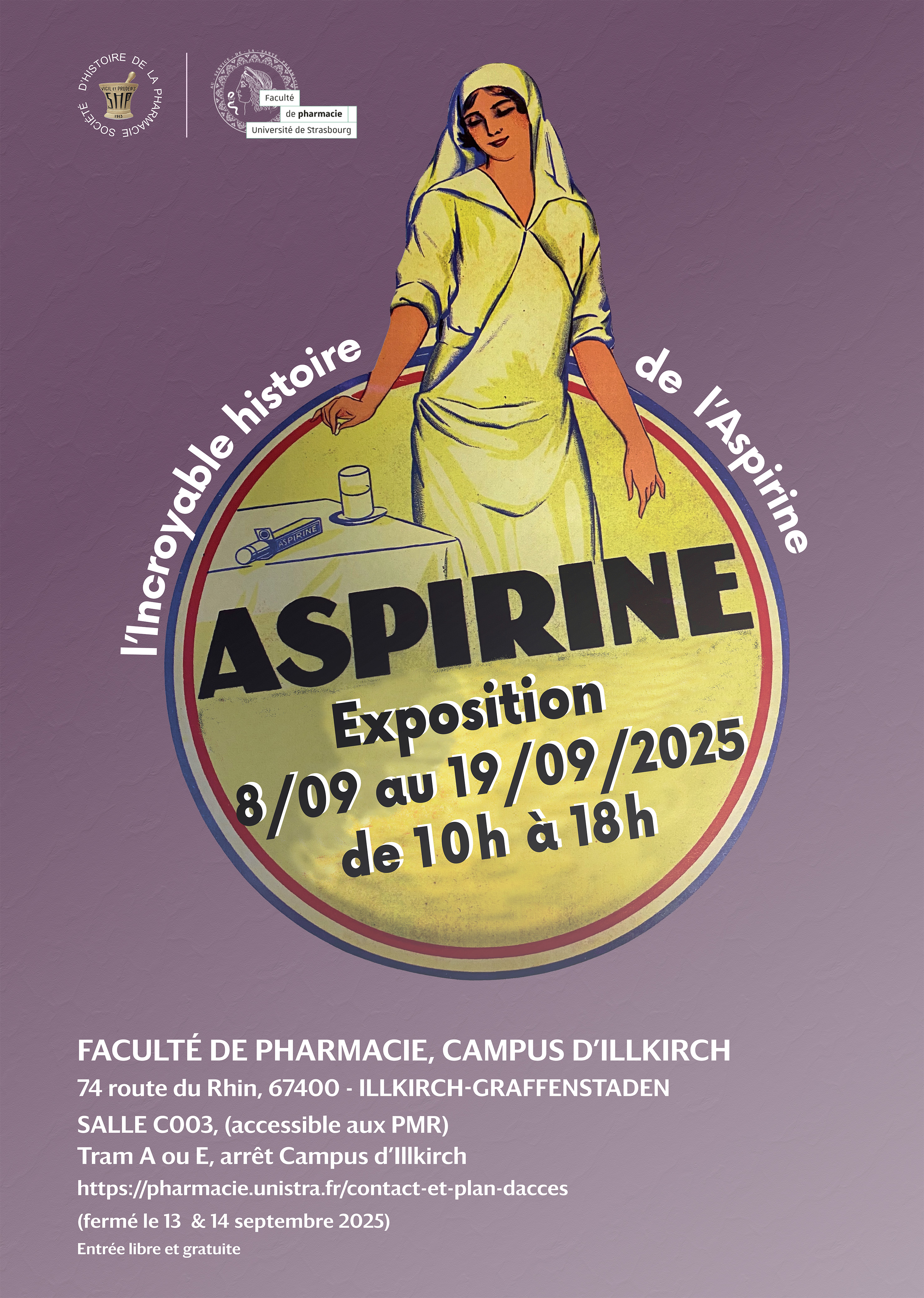 A la rentrée 2025, la Faculté de Pharmacie de l'Université de Strasbourg va accueillir pendant 15 jours l'exposition « Aspirine ». Elle aura lieu du lundi 8 au vendredi 19 septembre. Conçue par la Société d'Histoire de la Pharmacie (SHP), cette exposition présente des vitrines avec des objets précieux, des posters et une vidéo sur l’histoire et le développement de ce médicament. Strasbourg étant la ville natale de Charles Frédéric Gerhardt, l’accent sera mis sur le scientifique local qui, le premier, a synthétisé l’acide acétylsalicylique, la substance active de l’aspirine.