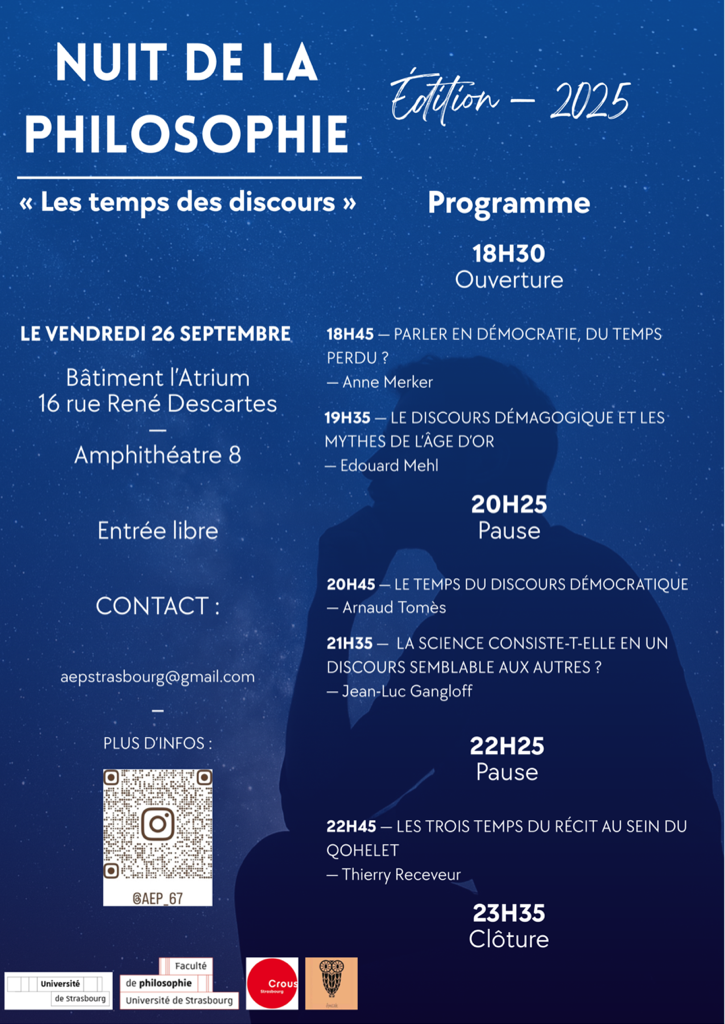 Une nouvelle Nuit de la Philosophie, édition 2025 sur le thème « Les temps des discours » aura lieu vendredi 26 septembre à 18h45 à l'Atrium sur le campus de l'Esplanade avec l'intervention des enseignants de la Faculté.